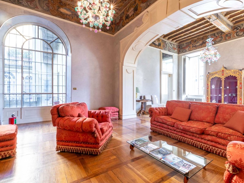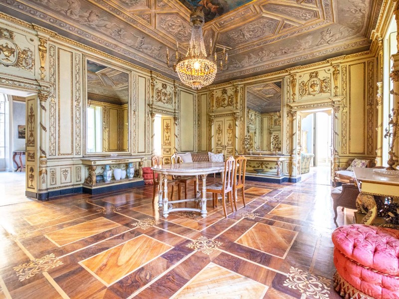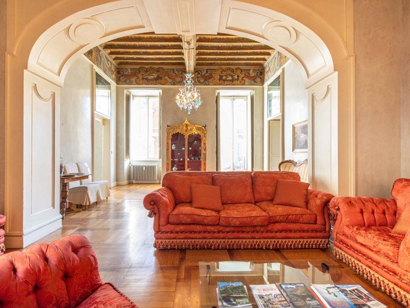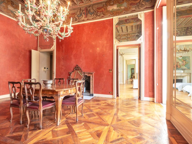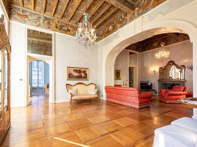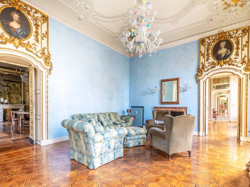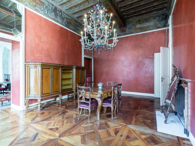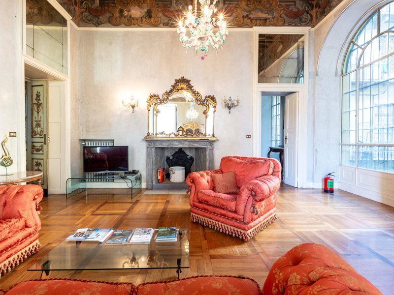 Lingresso introduce a un ampio soggiorno scenografico, perfetto per ricevere ospiti o vivere momenti conviviali in un contesto di grande charme. Si accede poi a tre saloni di rappresentanza, caratterizzati da soffitti affrescati a cassoni, ampie finestre ideali per eventi, ricevimenti o serate raffinate in unatmosfera elegante e senza tempo.
