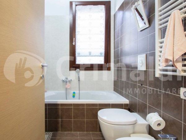 ingresso in soggiorno, angolo cottura aperto, terrazzino, disimpegno zona notte, bagno padronale con finestra, camera singola, camera matrimoniale con bagno dedicato con finestra. Esposizione tripla, climatizzatore, zanzariere, riscaldamento autonomo, infissi esterni in legno con doppi vetri, parquet nella zona notte; palazzina con pannelli solari e rampa box riscaldata.