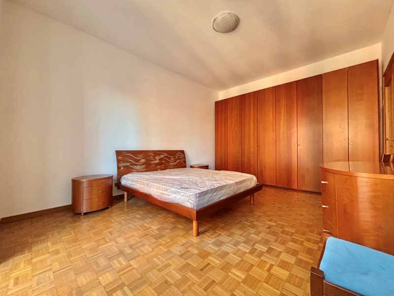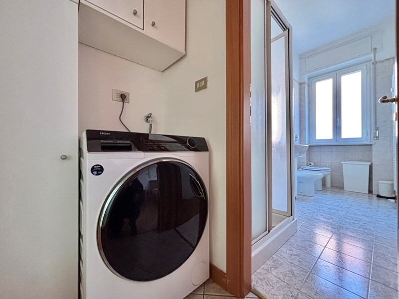 La zona notte è dotata di una zona lavanderia ottimamente integrata al bagno finestrato, completo di box doccia, che assicura praticità e comfort. L'ampia camera matrimoniale, infine, beneficia di un accesso diretto al balcone, dove potrete godere di un affaccio sul verde circostante, perfetto per momenti di relax e tranquillità.