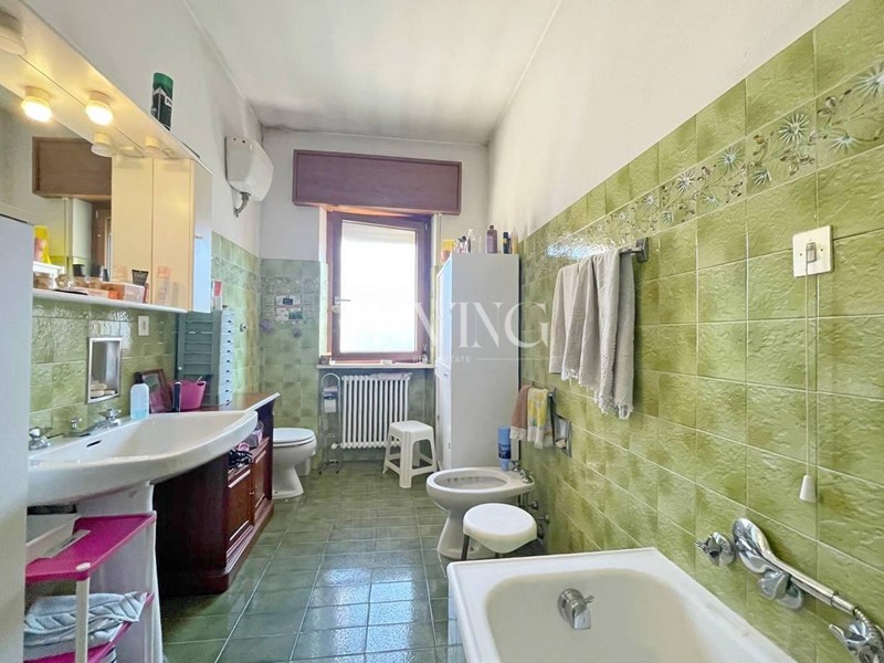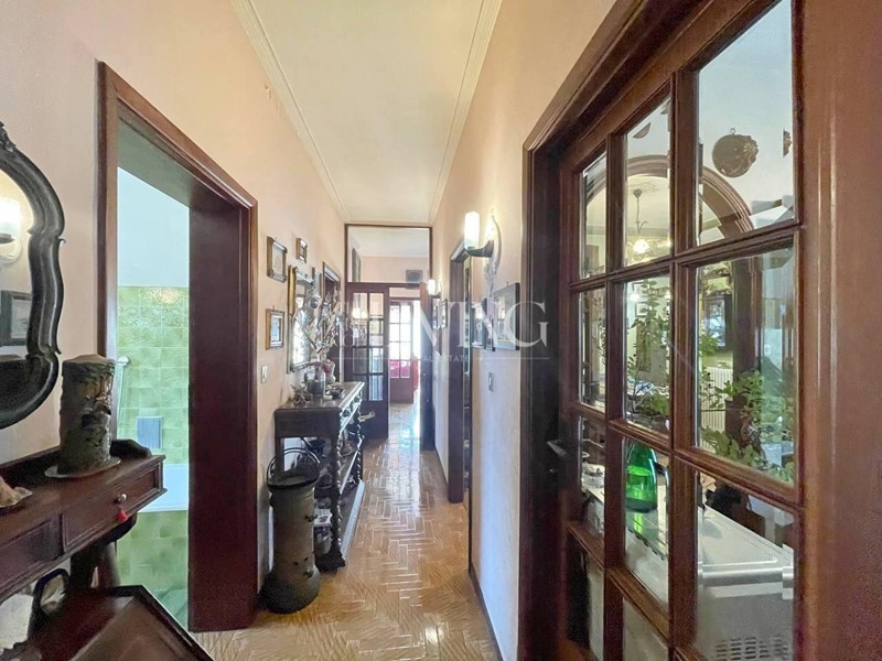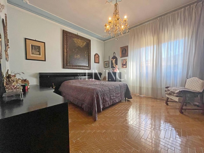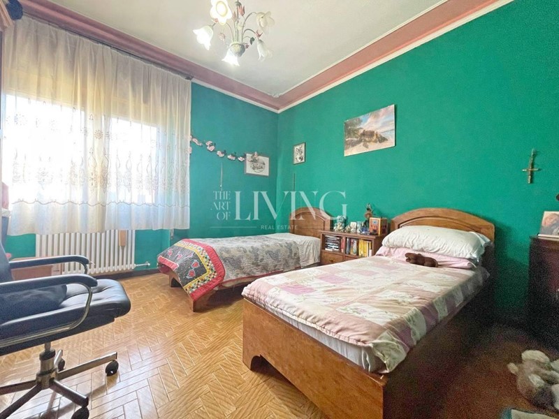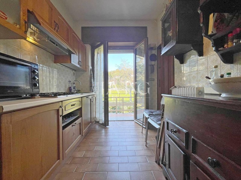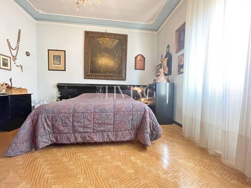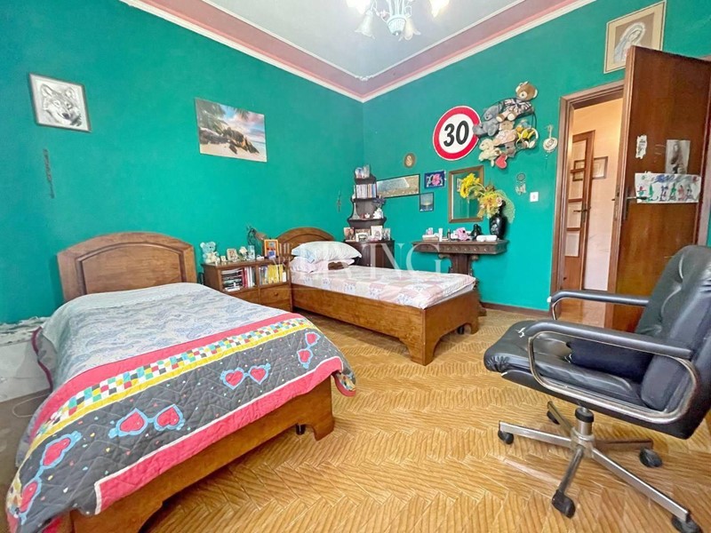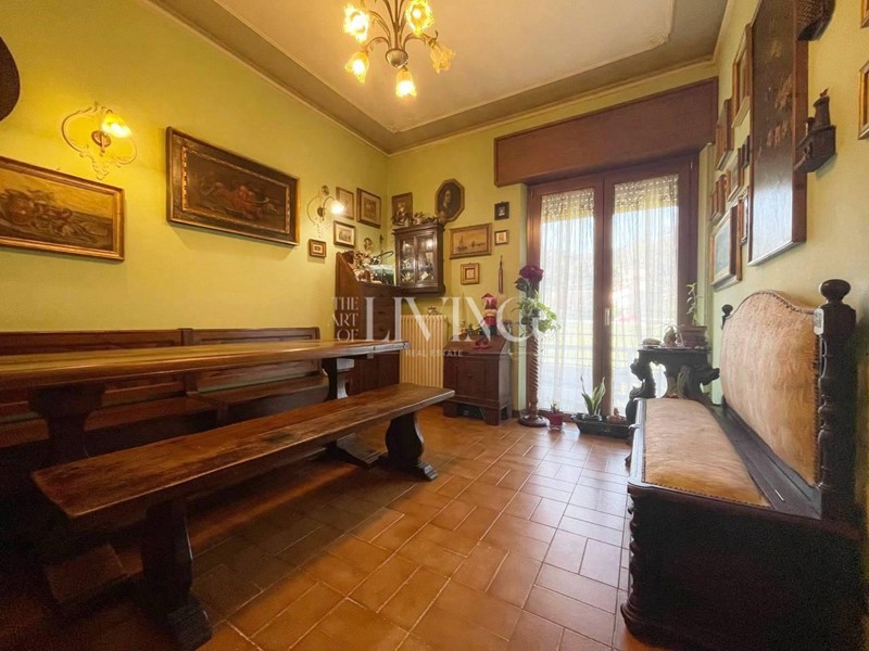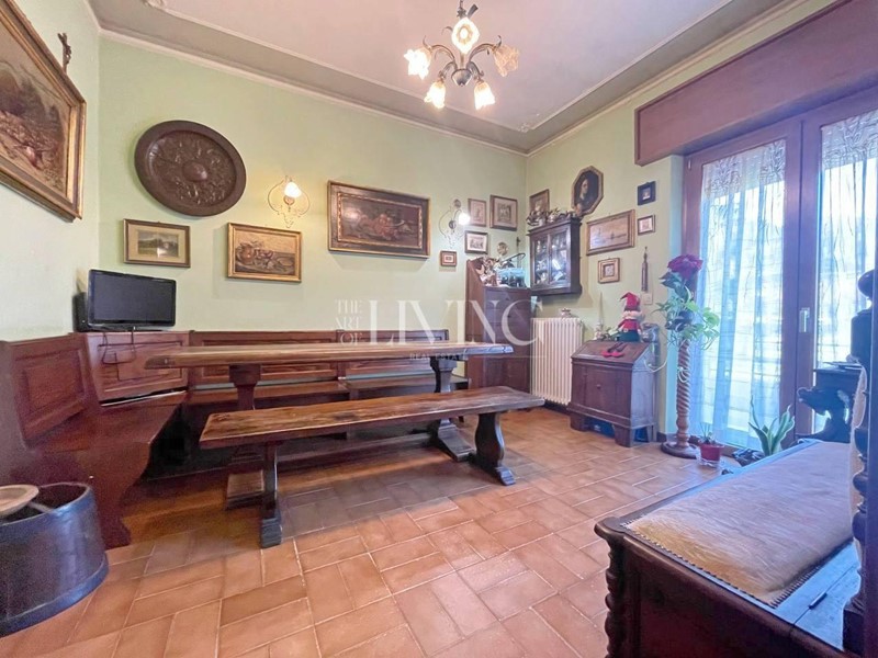 Il piano nobile offre un soggiorno luminoso esposto a sud, una cucina con zona living e ripostiglio, un bagno finestrato e tre camere di ampia metratura, ideali per chi ha bisogno di spazi funzionali e ben distribuiti.