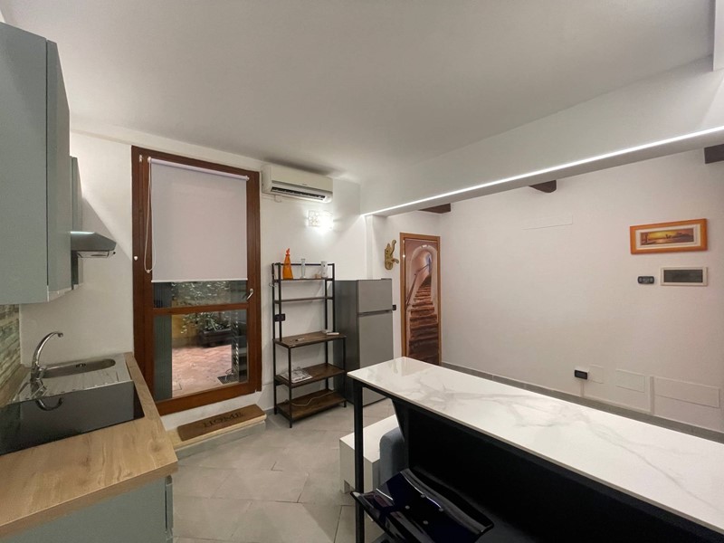 Ingresso su soggiorno con angolo cottura, porta finestra che fa accedere ad un piccolo giardino interno riservato completamente pavimentato, dotato di attacchi acqua. Una camera da letto matrimoniale di grandi dimensioni, un bagno finestrato con doccia.