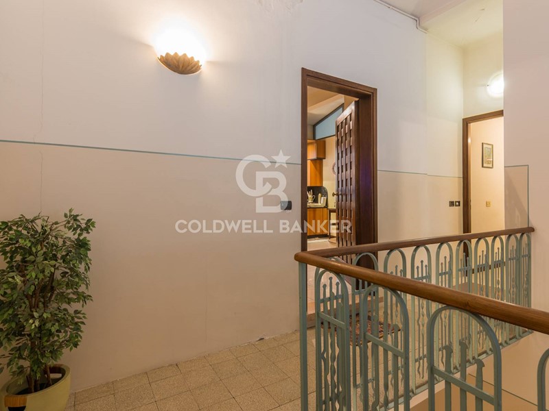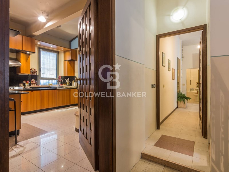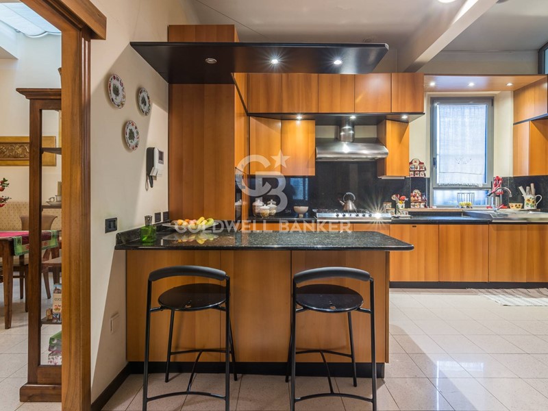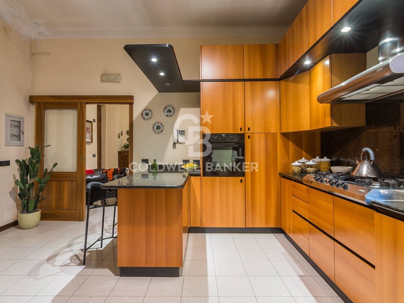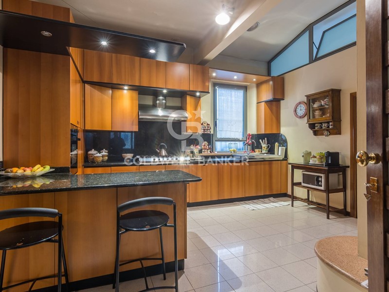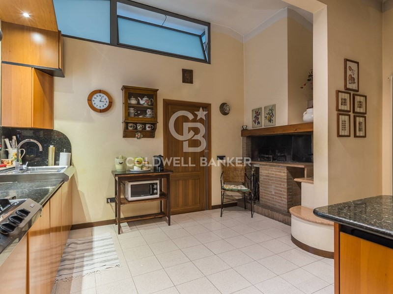 Attraverso lelegante corte interna si accede al primo piano, dove un invito signorile introduce alla sala cucina, un ambiente ricercato e accuratamente rifinito. La cucina, attrezzata con mobili in legno pregiato, penisola breakfast e un caratteristico camino barbecue in muratura, rappresenta il cuore conviviale della dimora.