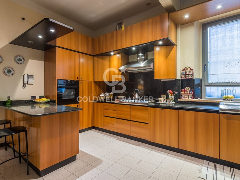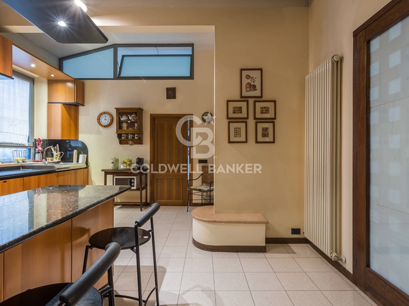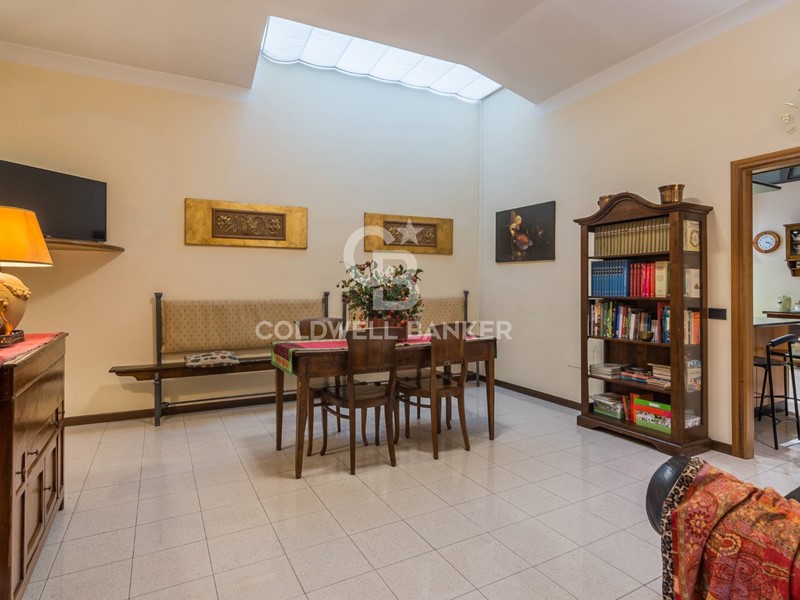 Adiacente alla cucina si apre la sala da pranzo, illuminata da un ornamentale lucernario che esalta la luminosità naturale e valorizza i dettagli architettonici e le finiture di pregio.