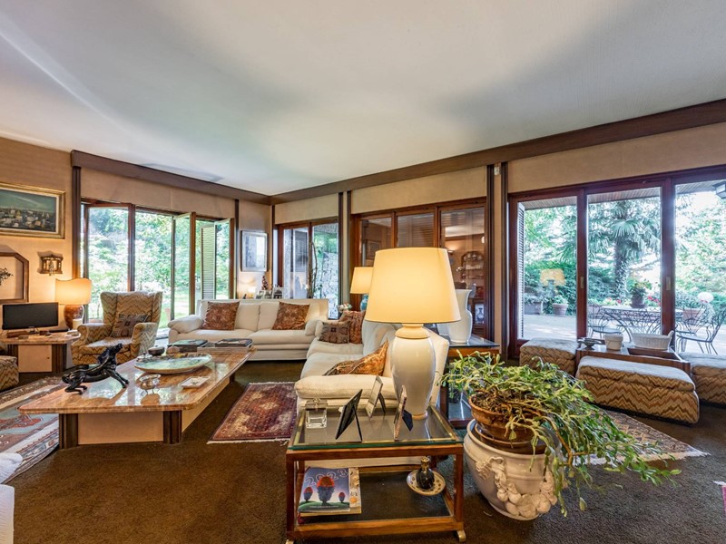 Le grandi vetrate affacciate sul giardino e sul terrazzo coperto conferiscono agli ambienti unatmosfera luminosa e rilassante.