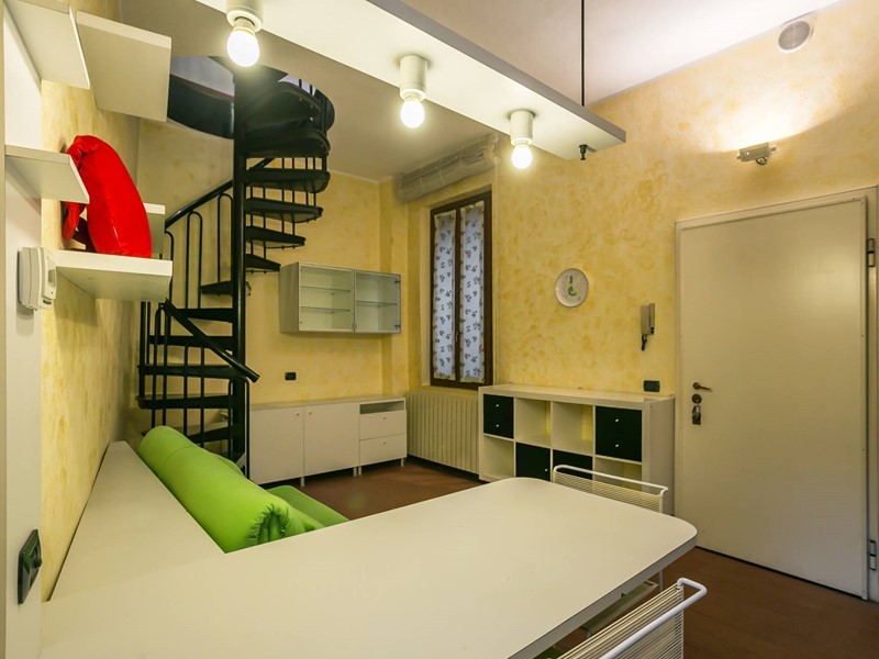 La soluzione si trova al primo piano di palazzina non dotata di ascensore e si dispone su due livelli: al piano d'ingresso zona giorno con angolo cottura e scala chiocciola che porta al piano superiore dove è presente una camera matrimoniale con balcone e il bagno finestrato con doccia.