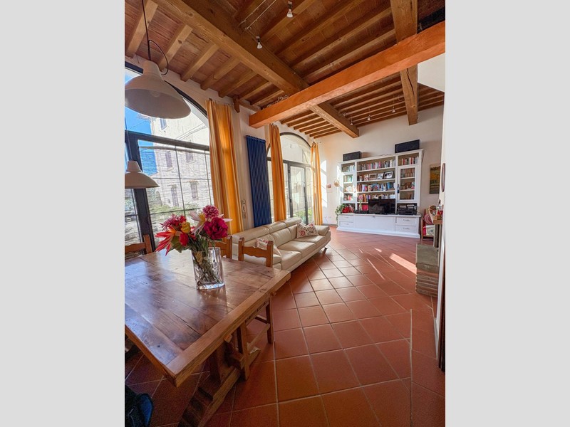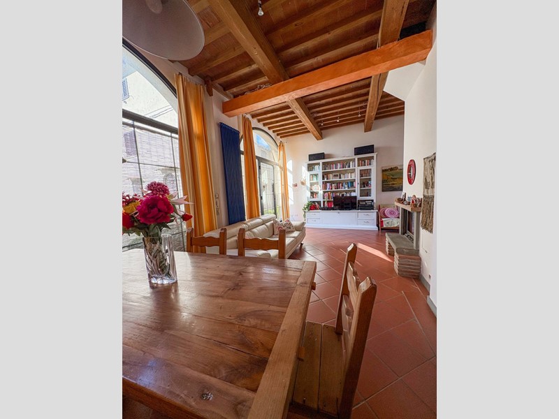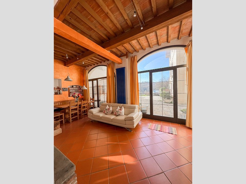 al piano terreno troviamo la sala doppia, corredata di camino, che ha due splendide aperture ad arco che le danno una grande luminosità, oltre alla cucina-pranzo, un bagno finestrato ed un piccolo resede di proprietà,