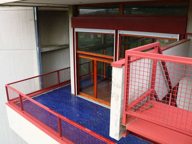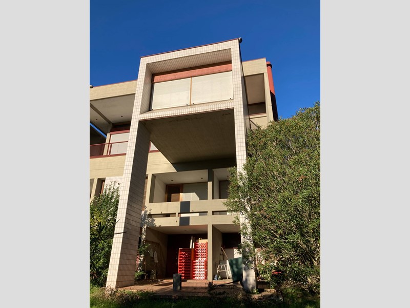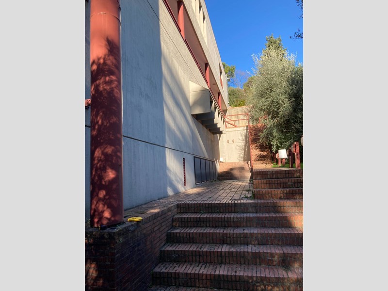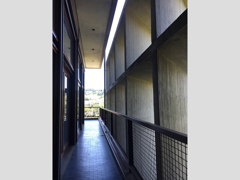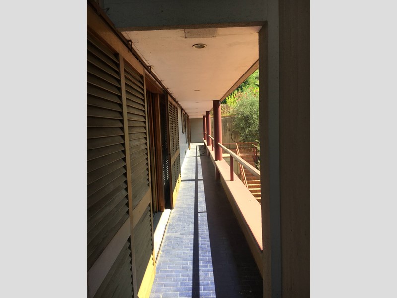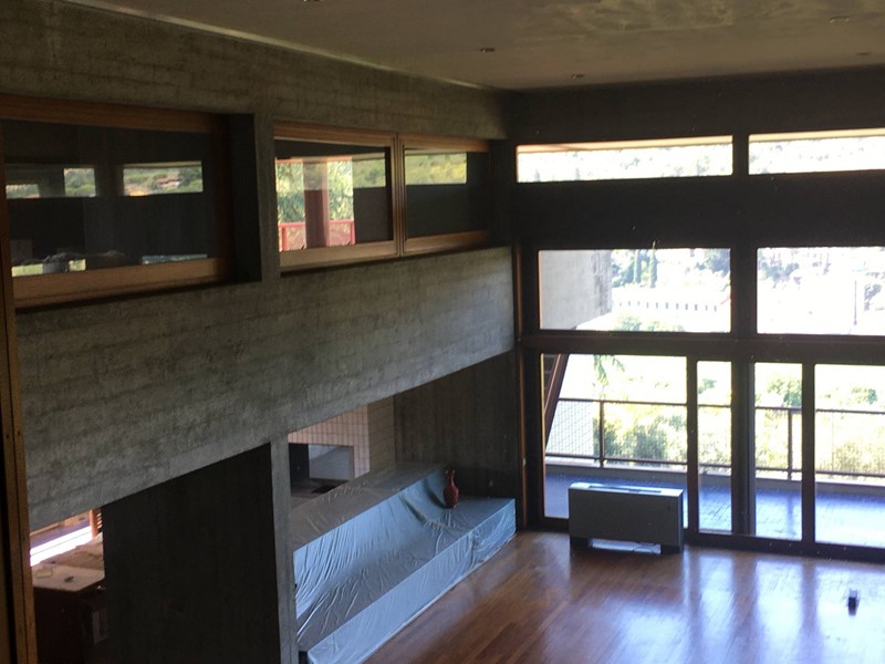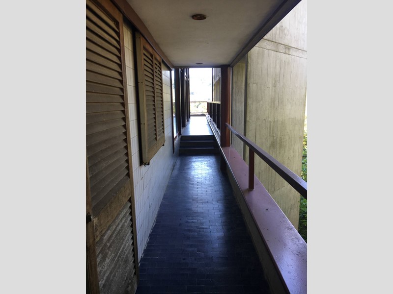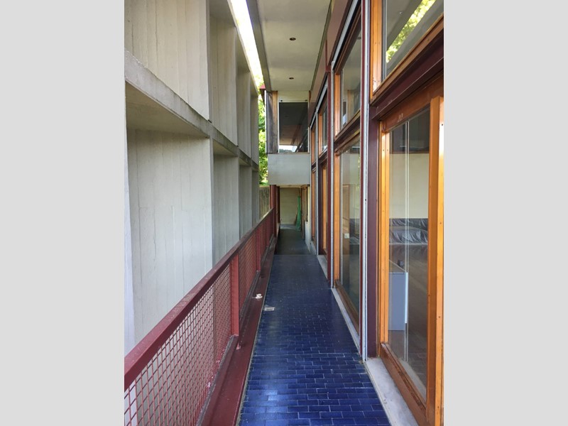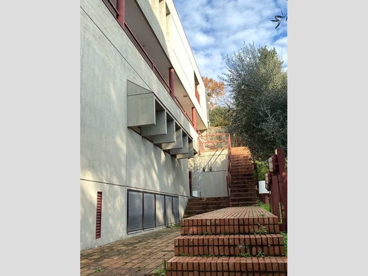 Esternamente il lato ovest è caratterizzato da brise soleil in cemento armato che protegge la casa dai venti dominanti.