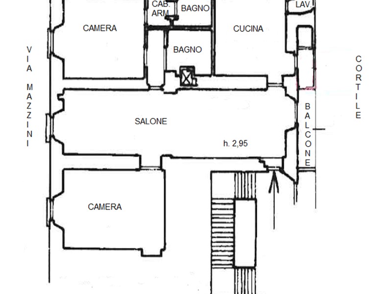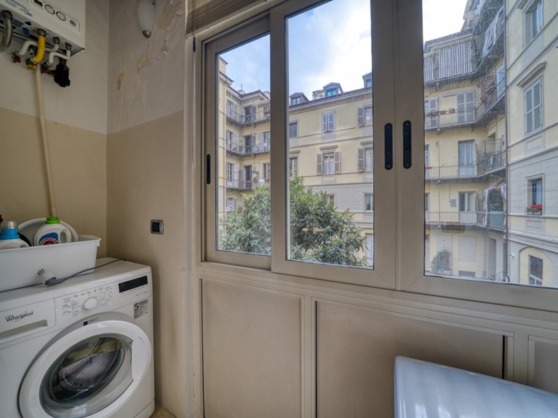 L'appartamento è composto da ingresso su ampio salone con esposizione su corte interna e su via Mazzini, 2 camere, cabina armadi, cucina abitabile, doppi servizi, disimpegni, balcone verandato adibito a lavenderia, altro balcone sul cortile. I pavimenti sono in palchetto, la ristrutturazione ha valorizzato i particolari d'epoca e la pianta dell'appartamento risulta molto razionale.