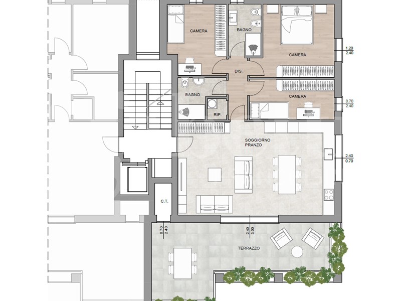 La zona notte, ben separata dalla zona giorno, è composta da una camera matrimoniale e da due camere singole, tutte luminose e ben proporzionate. A servizio della zona notte sono presenti due bagni, dotati di doccia, con finiture moderne e materiali di qualità.