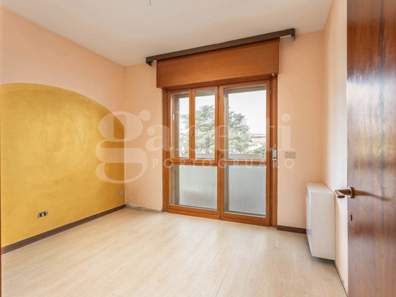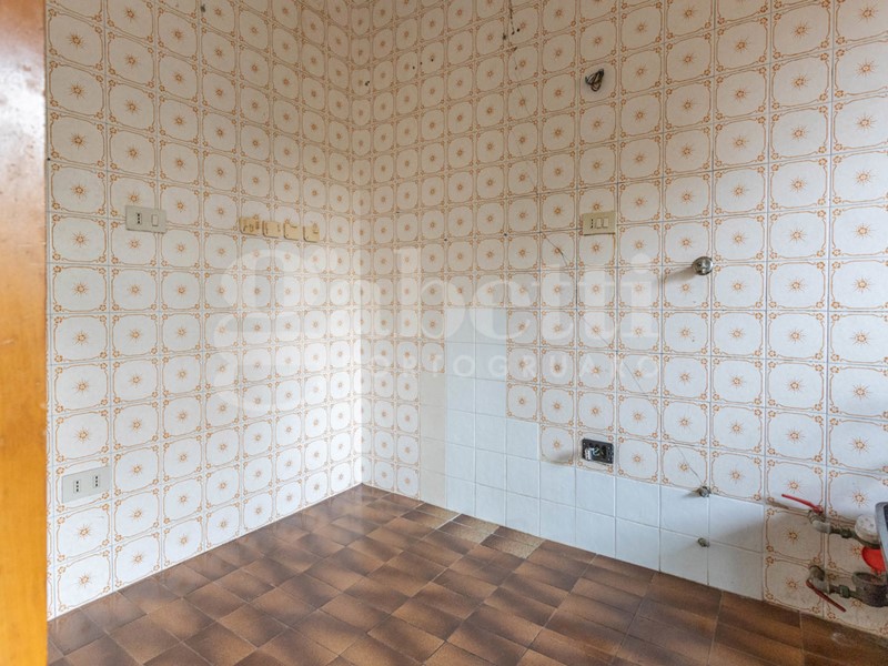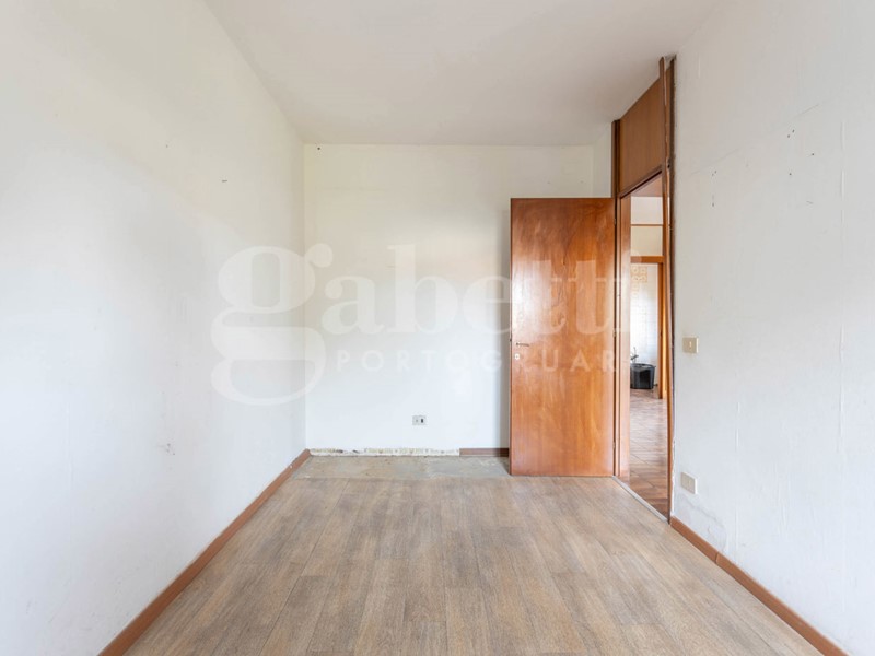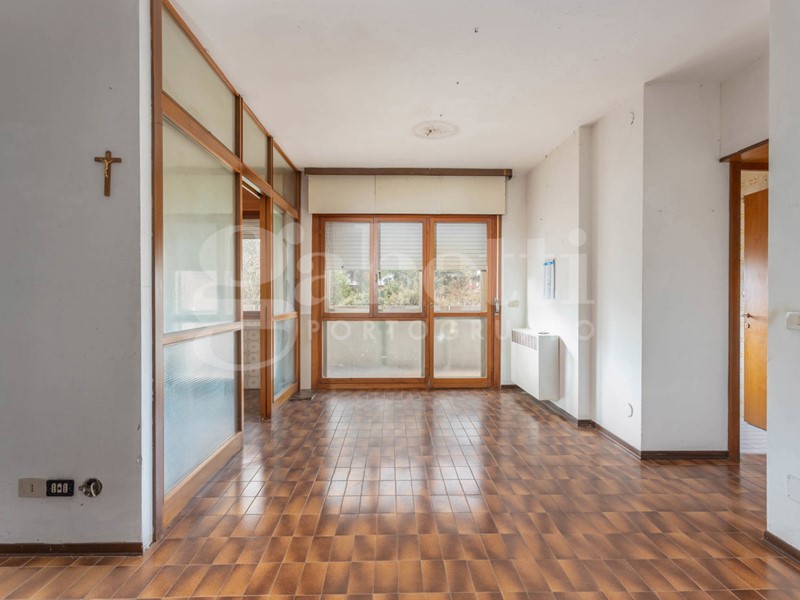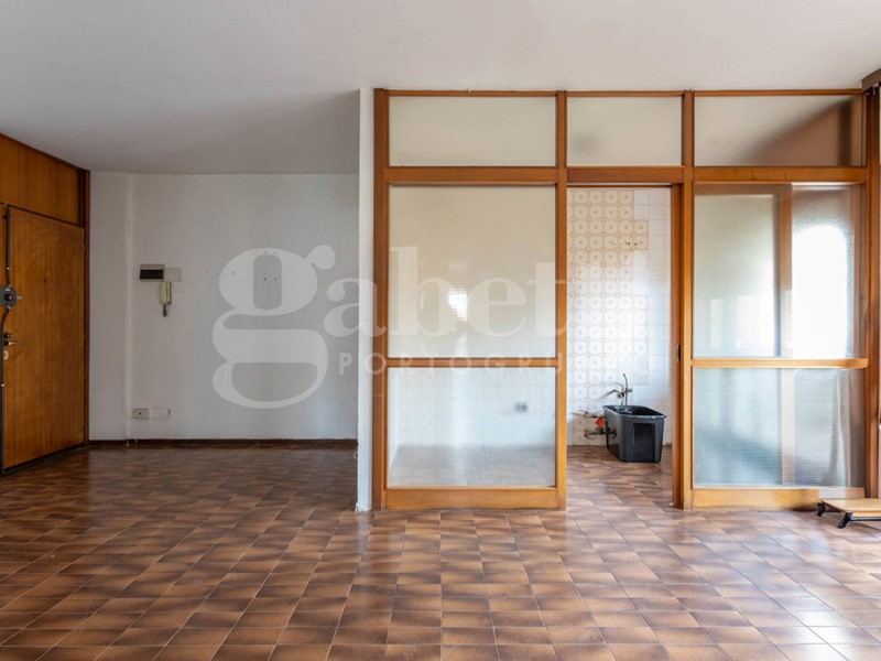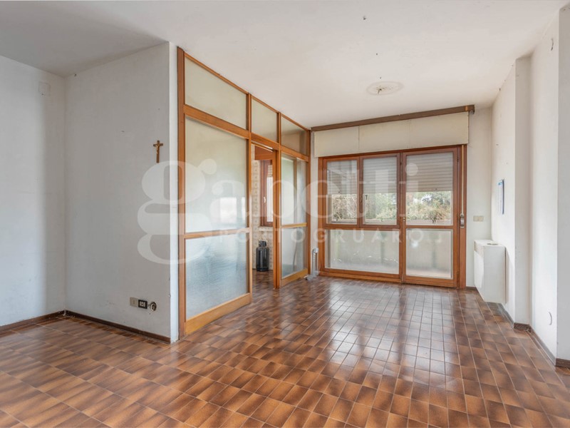 L'ingresso conduce a un soggiorno ampio e molto luminoso, valorizzato dalla grande vetrata che si affaccia sul terrazzo e sul verde circostante. Adiacente al soggiorno si trova la cucina, attualmente separata da una parete vetrata in legno: un elemento che offre diverse possibilità di reinterpretazione. In un progetto di ristrutturazione si può infatti valutare l'eliminazione della parete per creare un unico ambiente giorno moderno e aperto, oppure la sua sostituzione con una nuova struttura in vetro dal design contemporaneo, capace di mantenere la separazione senza rinunciare alla luminosità.