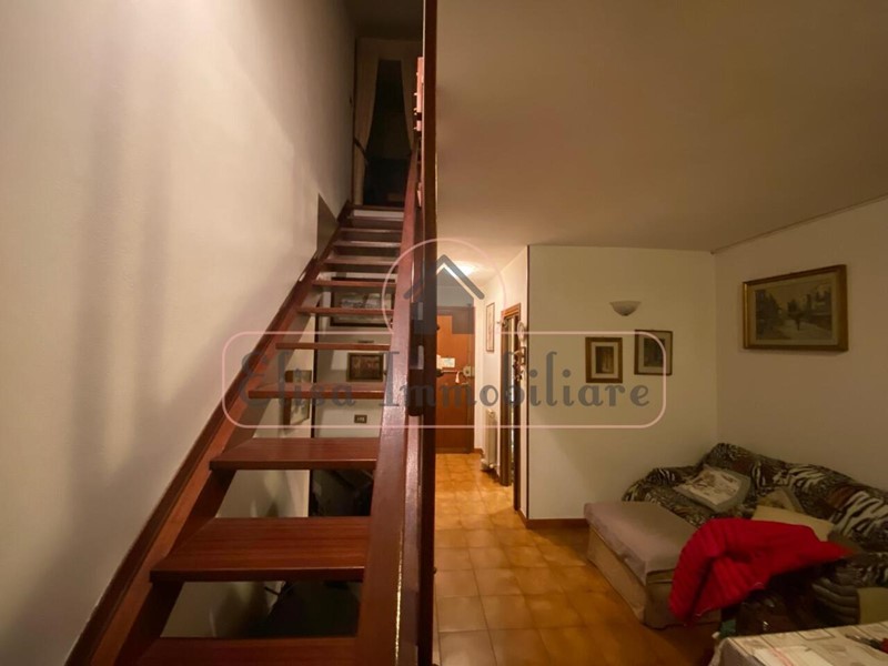 Dal soggiorno, tramite una scala in legno, si accede al secondo livello dove si trova un grande vano mansardato attualmente adibito a camera, con accesso a un’ulteriore terrazza verandata.
