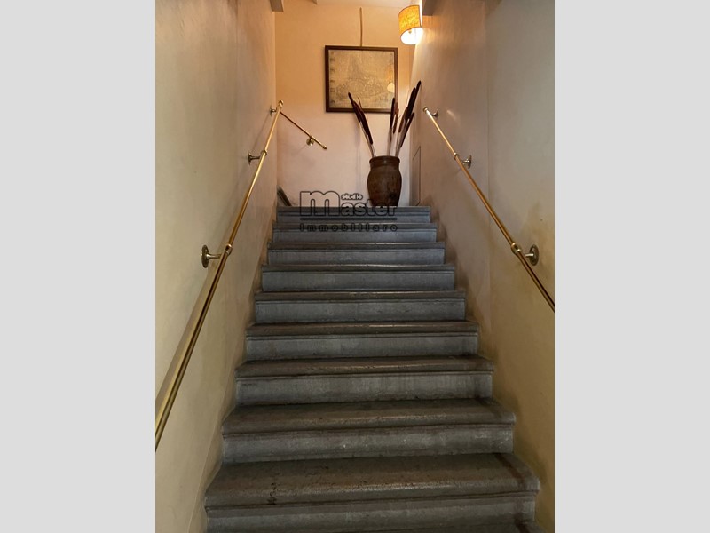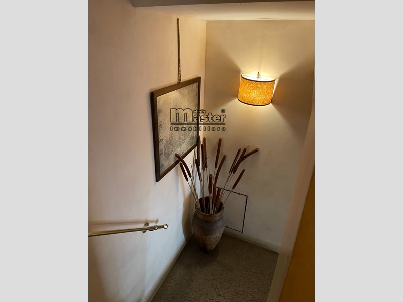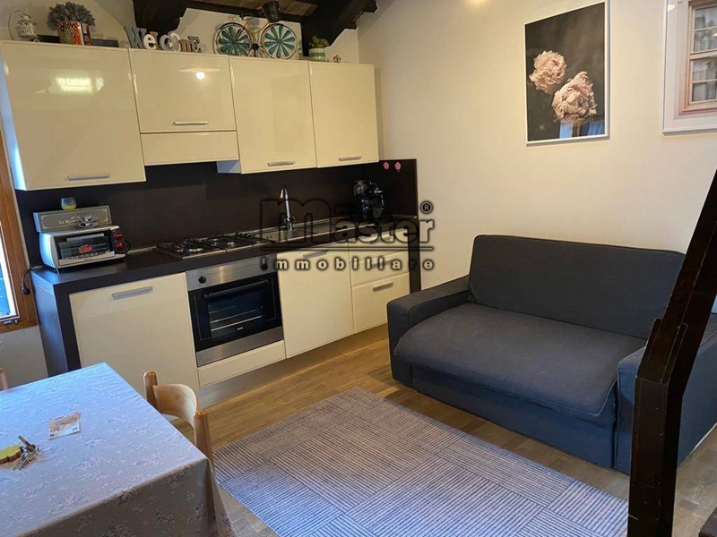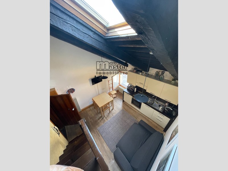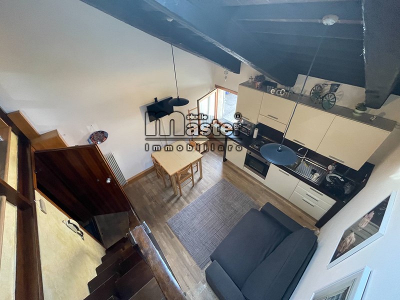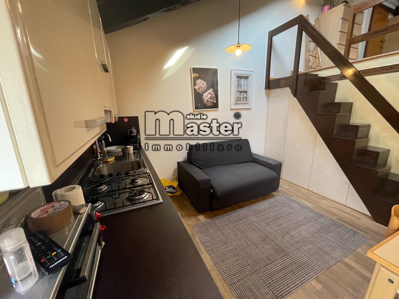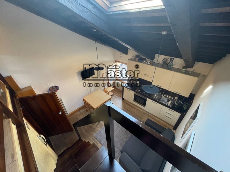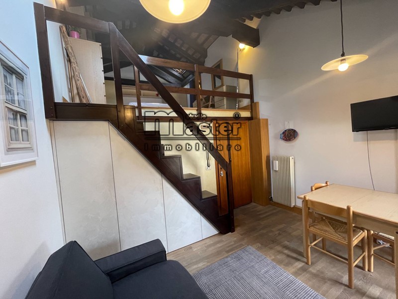 L'appartamento è disposto su due livelli, l'ingresso si apre su una zona living con cucinotto, con una scala in legno si accede ad un soppalco dove troviamo la camera matrimoniale, una cabina armadio e un bagno dotato di doccia e lavatrice.