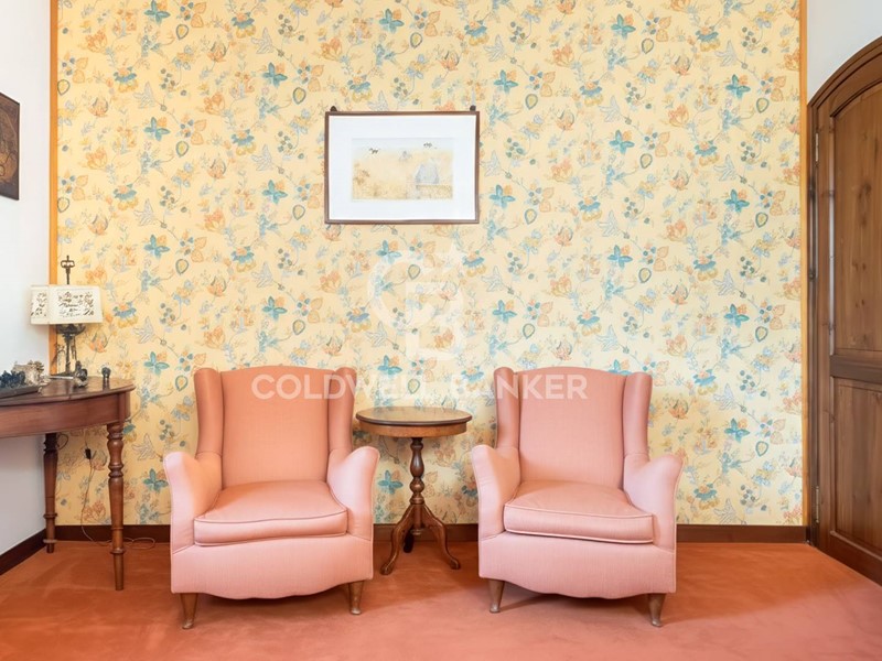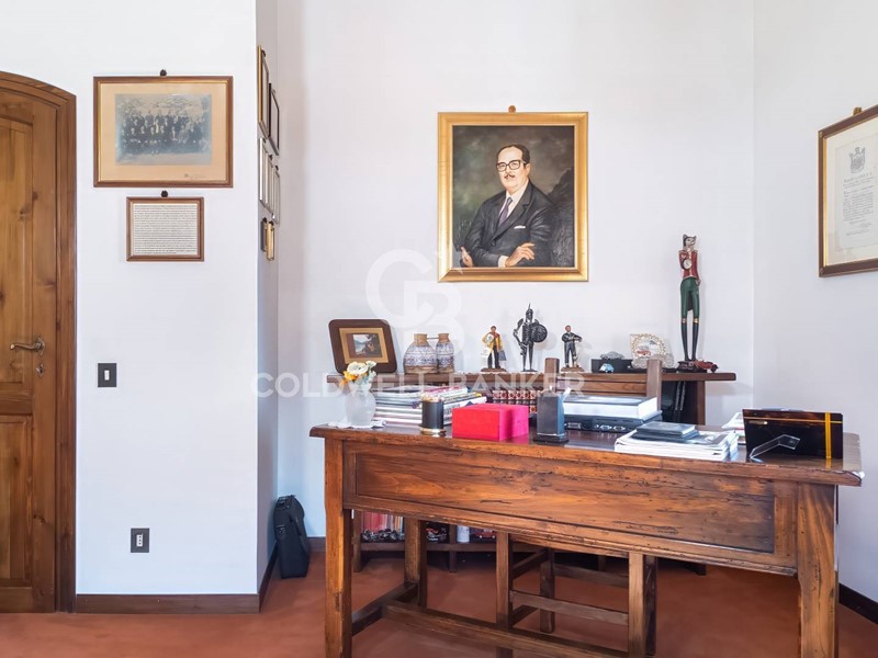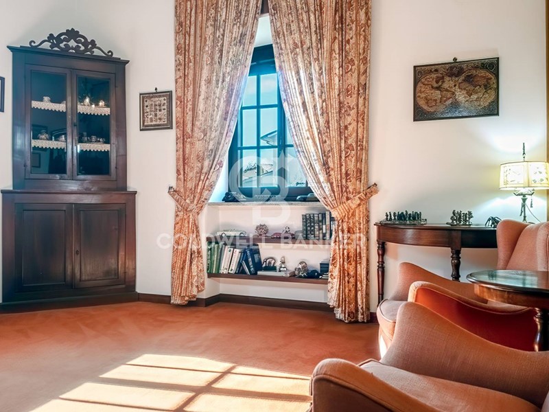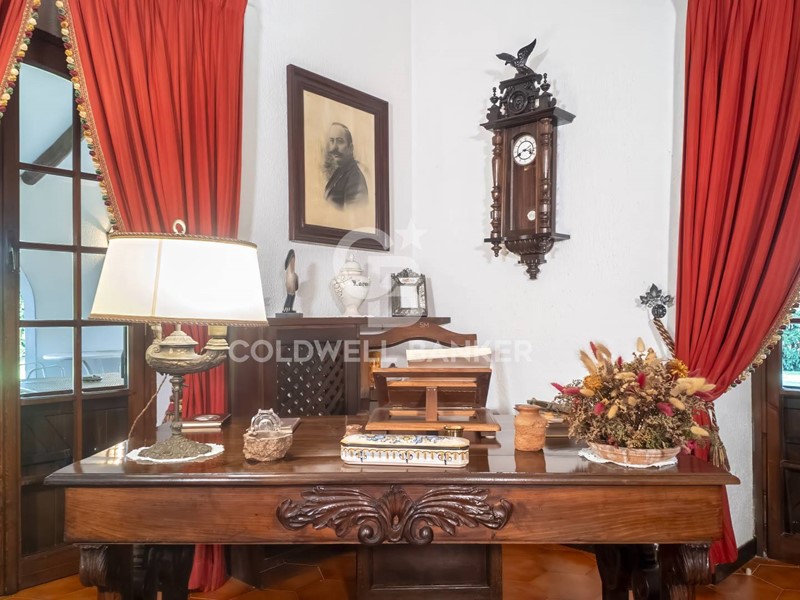 Lingresso accoglie con stile classico e dettagli ricercati e introduce in un salone imponente, un camino d'epoca che scalda l'atmosfera e un angolo studio discreto, tra mobili antichi e luce naturale.