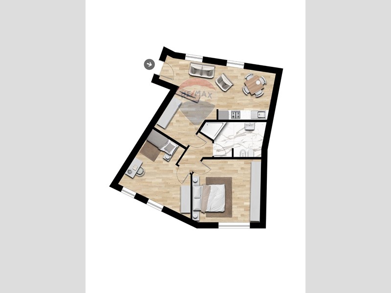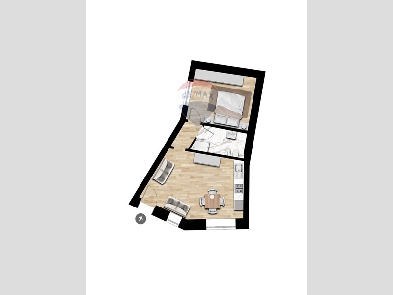 Im ersten Stock befindet sich eine weitere Wohnung (laut Projekt), bestehend aus zwei Schlafzimmern und einem Wohnbereich mit offener Küche sowie einem Badezimmer.