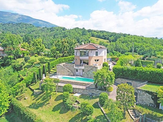 Il giardino è ampiamente terrazzato e pavimentato con balze in pietra a vista con vedute panoramiche praticamente da tutti le angolazioni, dotato di piscina a sfioro riscaldata di mq 50 con ampia area pavimentata come sundeck, ingresso pedonale ed ingresso carrale con comodo accesso all'autorimessa doppia.