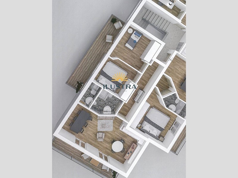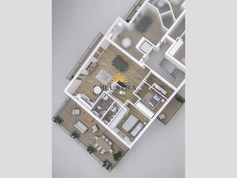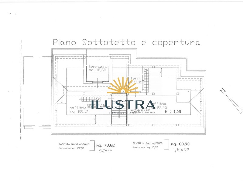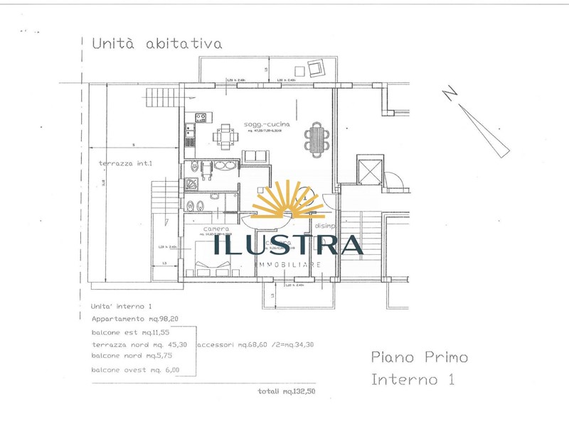 - Appartamento trilocale 132 mq commerciali, 98 mq calpestabili, balcone est 11.5 mq, balcone nord 5,75 mq, balcone ovest 6 mq, terrazza nord 45mq