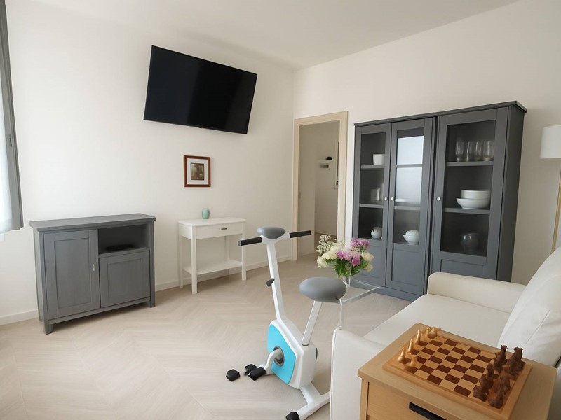 b) e c) due camere con letto matrimoniale, TV e scrivania a muro, letto singolo ortopedico elettrico, poltroncina-letto per un bimbo piccolo.