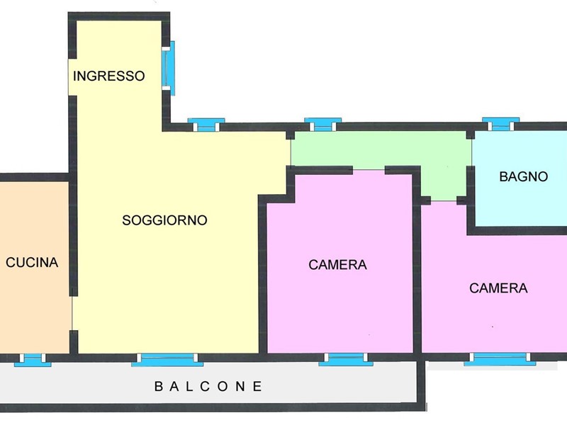 Ampio locale ingresso, soggiorno, cucinotto, 2 camere, bagno.