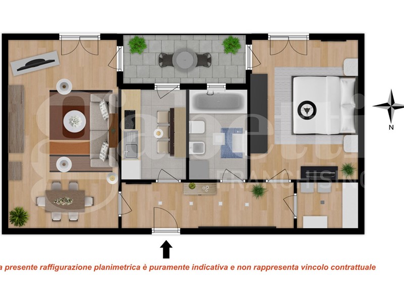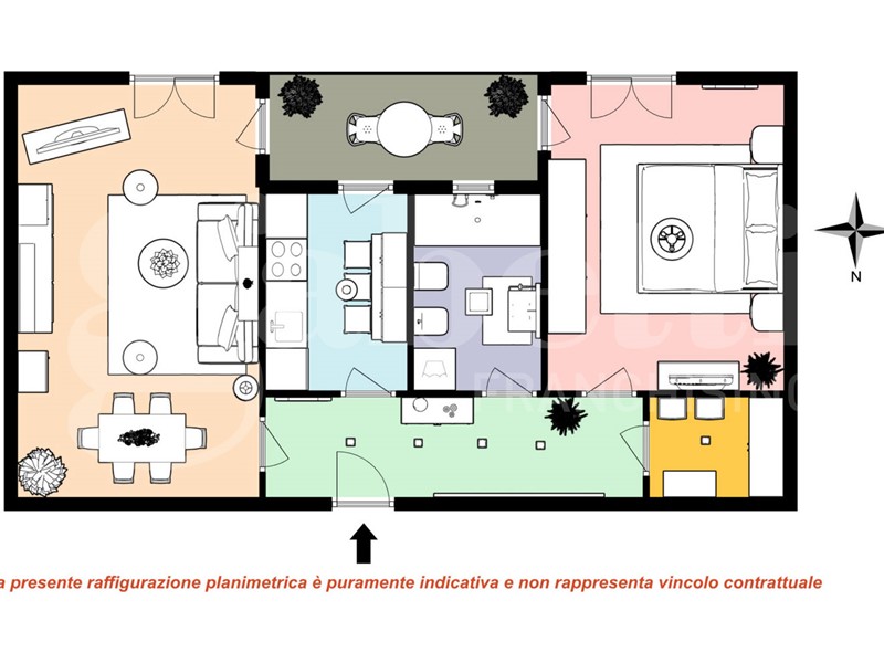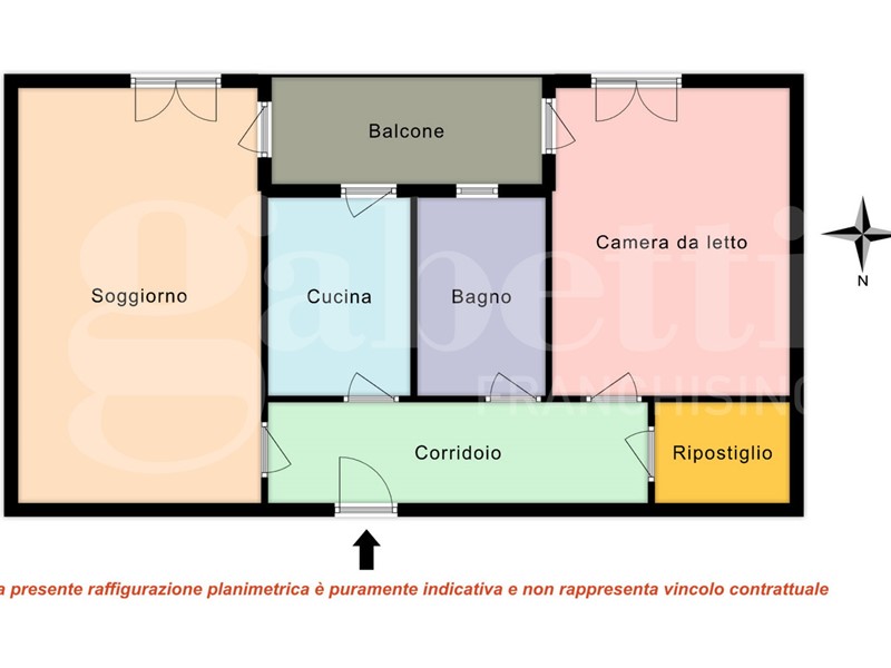 ingresso su disimpegno, soggiorno, cucina e camera matrimoniale, tutte con accesso al terrazzino, bagno finestrato dotato di vasca e comodo ripostiglio.