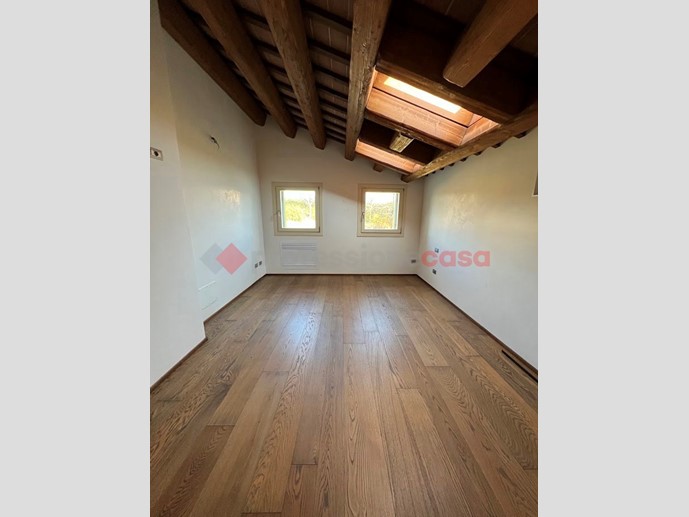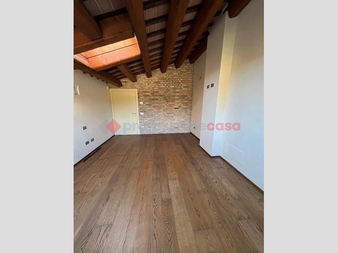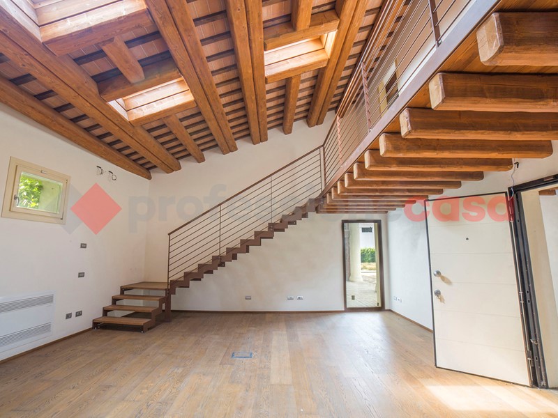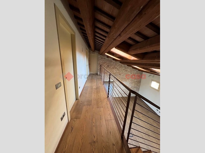 Al piano terra si apre un ampio soggiorno doppio con cucina a vista, pensato per un vivere moderno e conviviale, con affacci che valorizzano la luce naturale. Al piano superiore si sviluppa la zona notte, composta da due camere da letto e un bagno. Il parquet presente in tutta la casa conferisce calore e continuità estetica agli spazi, esaltando l'eleganza architettonica dell'immobile.