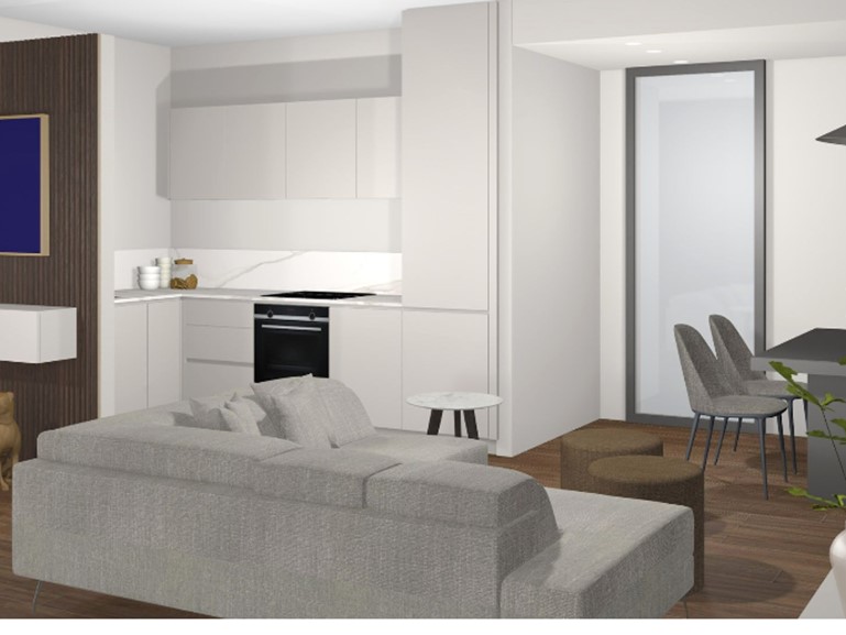 L'appartamento è composto da un'ampia zona giorno con cucina a vista e ampio terrazzo, ideale per rilassarsi e godere del panorama. Il disimpegno porta alla camera matrimoniale e alla cameretta, entrambe con finestre che illuminano gli ambienti. Completano l'appartamento il bagno finestrato, il ripostiglio e un garage privato con cantinetta collegato alle scale interne.