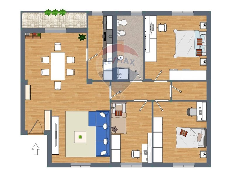 Limmobile si sviluppa su una superficie ben distribuita in cinque vani, offrendo ambienti ampi, luminosi e accoglienti. Lingresso conduce a un grande soggiorno e a una sala da pranzo da cui si accede direttamente al terrazzo, perfetto per momenti di relax allaperto o per pranzi estivi. La cucina è separata e funzionale, ideale per chi ama cucinare in un ambiente ben organizzato.