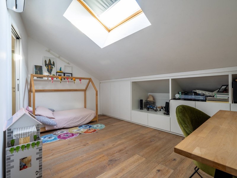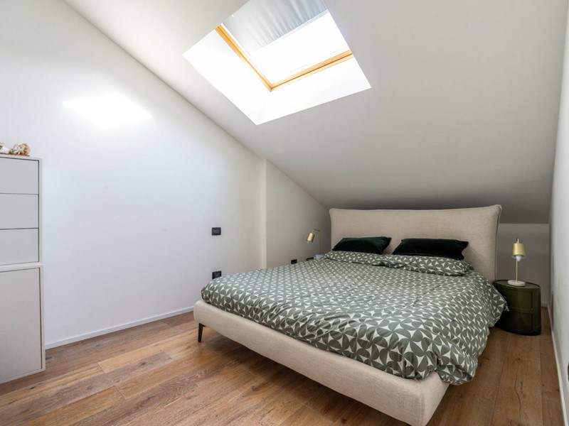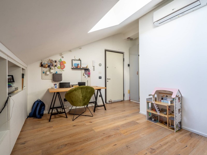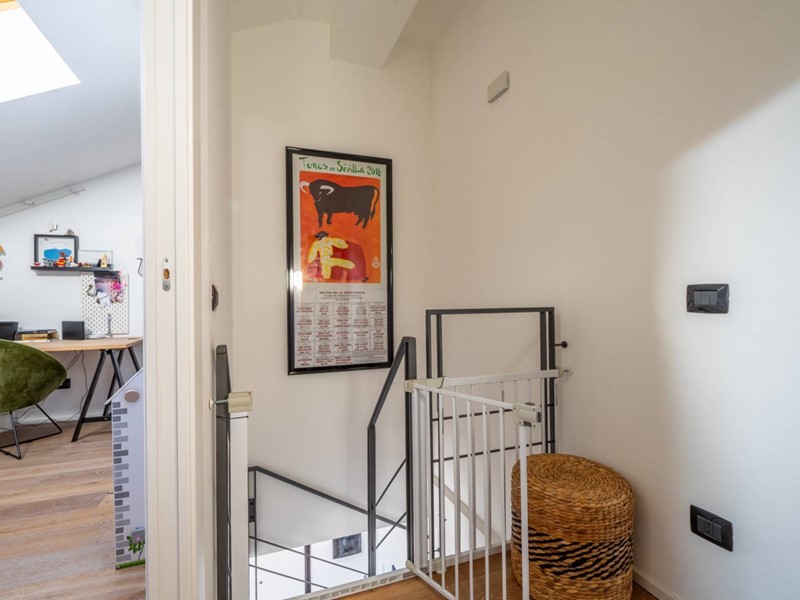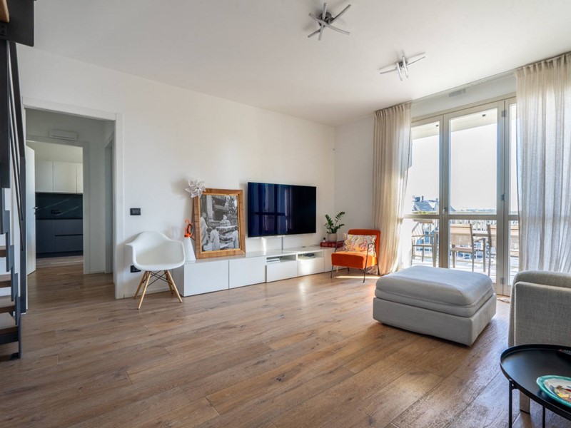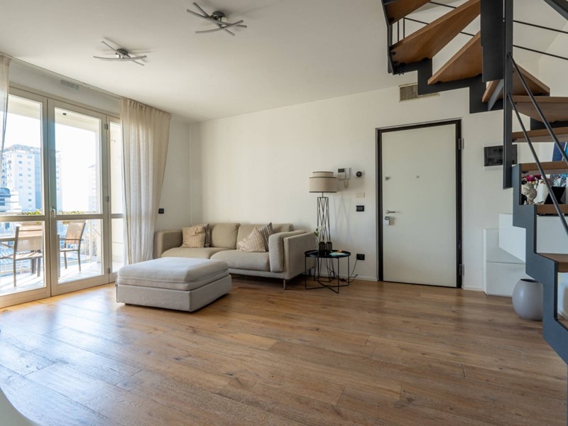 Si accede all'appartamento al sesto piano, accolti da un luminoso soggiorno con terrazzino, poi tramite comodo dismpegno attrezzato si accede alla cucina abitabile, anch'essa con accesso al terrazzino della zona giorno e al bagno. Una scenografica scala a vista con gradini sospesi, conduce alla zona notte mansardata, dove si trovano due ampie camere da letto e il bagno. E' possibile accedere al piano superiore tramite ingresso diretto con porta blindata dal settimo piano. Riassumendo, il trilocale è composto da una zona giorno al piano sesto, dove trovano spazio soggiorno, bagno con finestra, cucina abitabile e terrazzino con accesso sia dal soggiorno che dalla cucina e da una zona notte abitabile al piano settimo mansardato, con due camere e bagno. Insomma, un appartamento comfotevole ideale per una famiglia o per chi desidera uno spazio abitativo ampio e confortevole. Dal terrazzino attrezzato, si può godere di una splendida vista aperta, ideale per rilassarsi o per organizzare cene e aperitivi all'aperto.