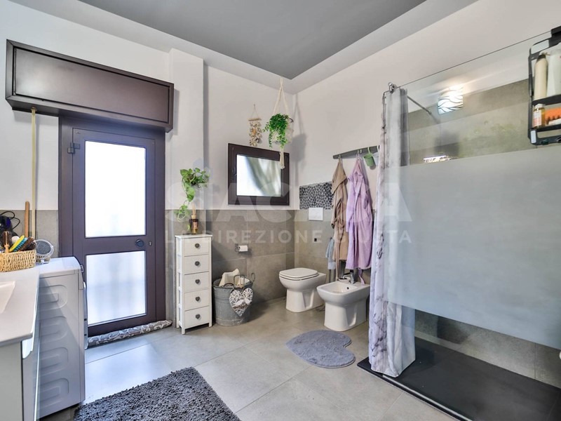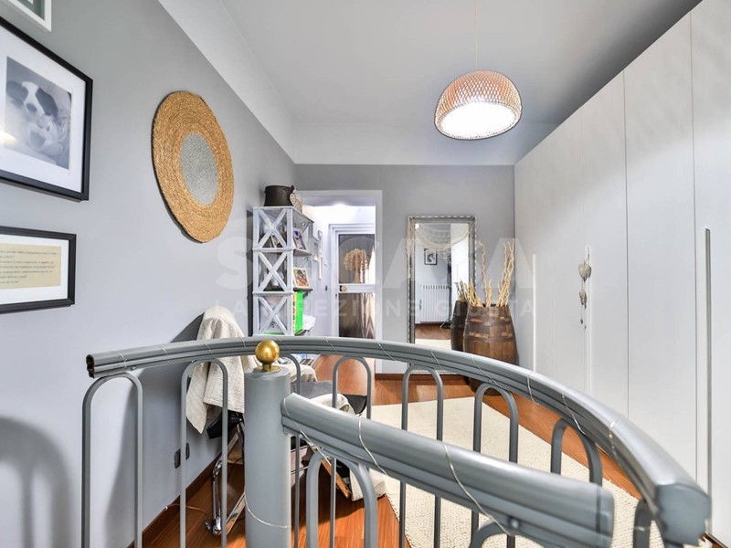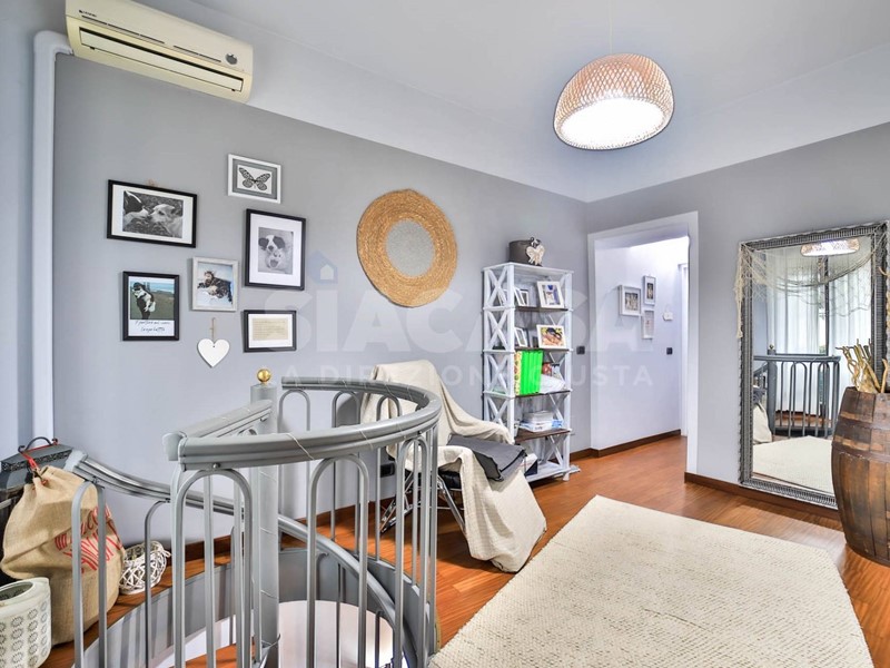 Salendo al primo piano, la zona notte si apre in modo armonioso: una camera matrimoniale, un ampio bagno finestrato con porta-finestra sul terrazzo di 9 mq, perfetto per godersi luce e aria aperta, e un ulteriore ambiente studio/cameretta, ideale per il lavoro da casa o per accogliere ospiti.