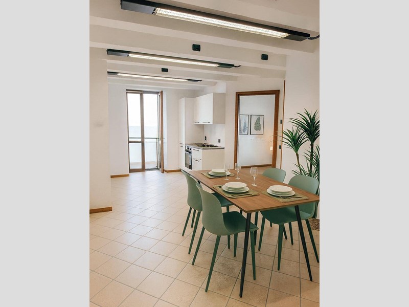 ZONA GIORNO adibita a soggiorno e sala da pranzo con tavolo e sedie nuovi già posizionati.