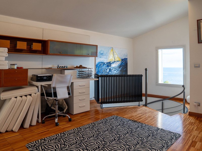 Un piano interamente dedicato alla privacy: la camera padronale vista mare è un vero rifugio affacciato sullorizzonte, con bagno en suite, cabina armadio e una zona oggi adibita a studio. Da qui si accede a un ulteriore terrazzo panoramico e alla parte superiore del giardino, dove trova spazio una splendida piscina vista mare, incorniciata dal cielo e dallorizzonte.