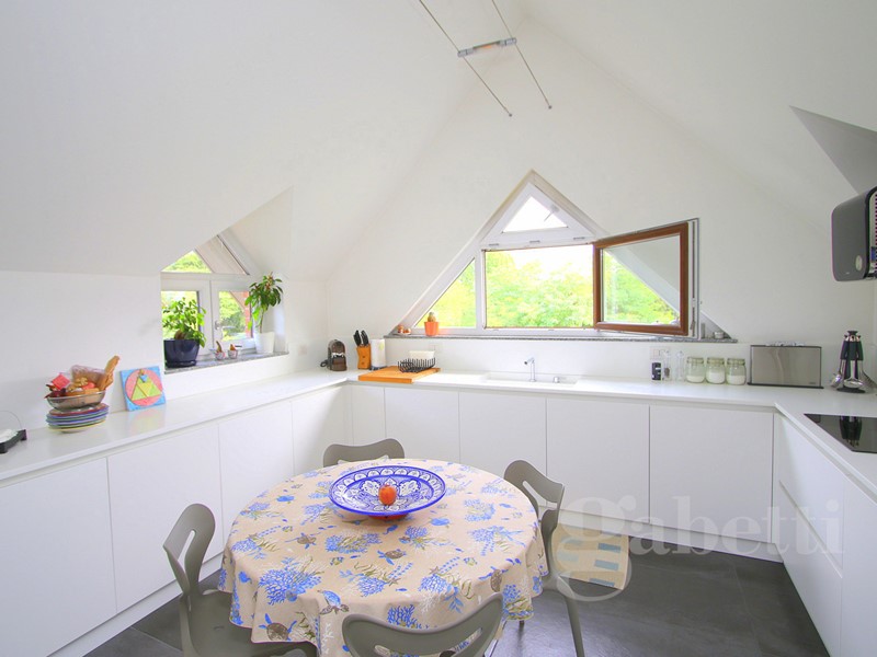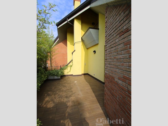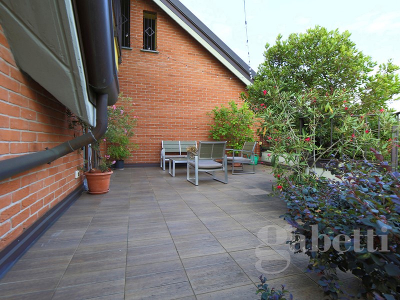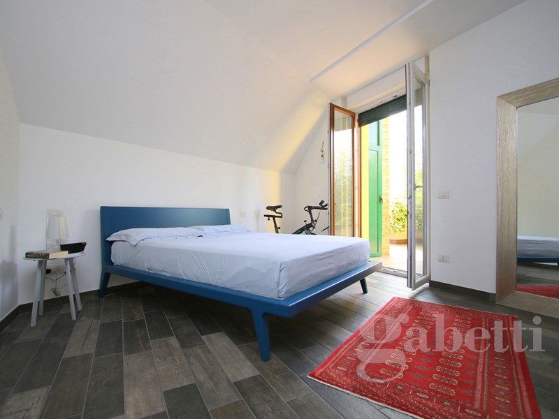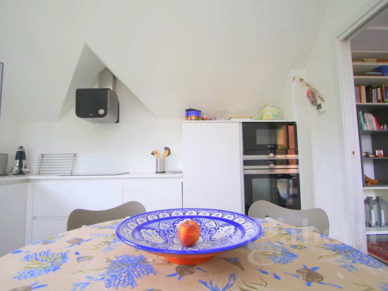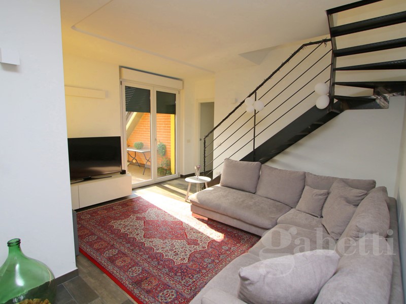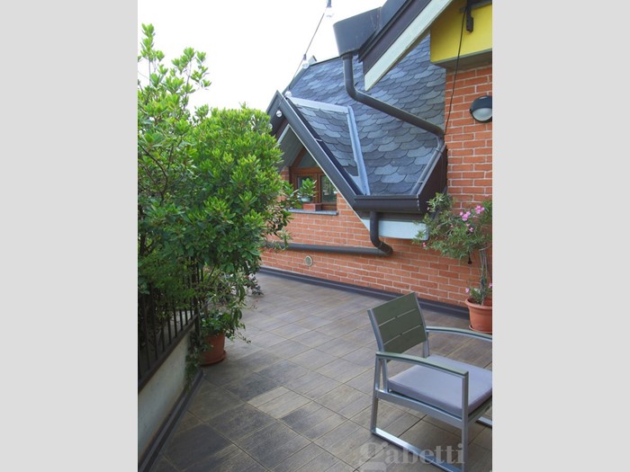 L'ingresso, al terzo piano della palazzina, è sull'ampio disimpegno dal quale si raggiungono: la cucina abitabile di pianta quadrata, caratterizzata dal soffitto a spiovente e da due finestre triangolari che ne riprendono il movimento; il soggiorno, piacevole spazio relax con affaccio sul terrazzo di 40mq che costituisce naturale prosecuzione della zona giorno e sfruttabile come ulteriore grande zona pranzo/relax; presenti al piano anche una camera da letto matrimoniale dotata di ulteriore terrazzo di 30mq e bagno con vasca.