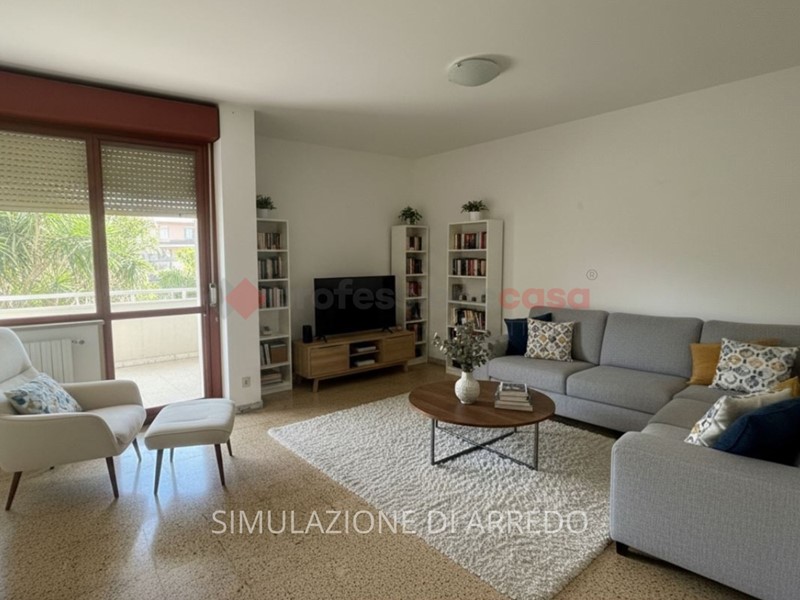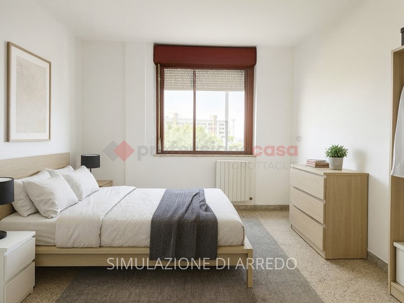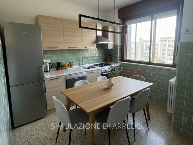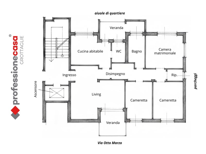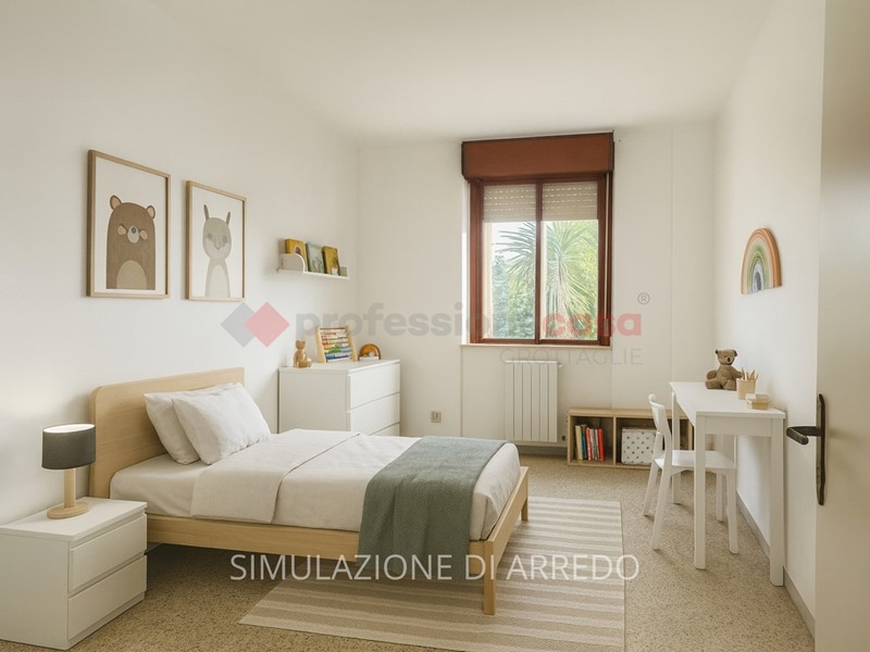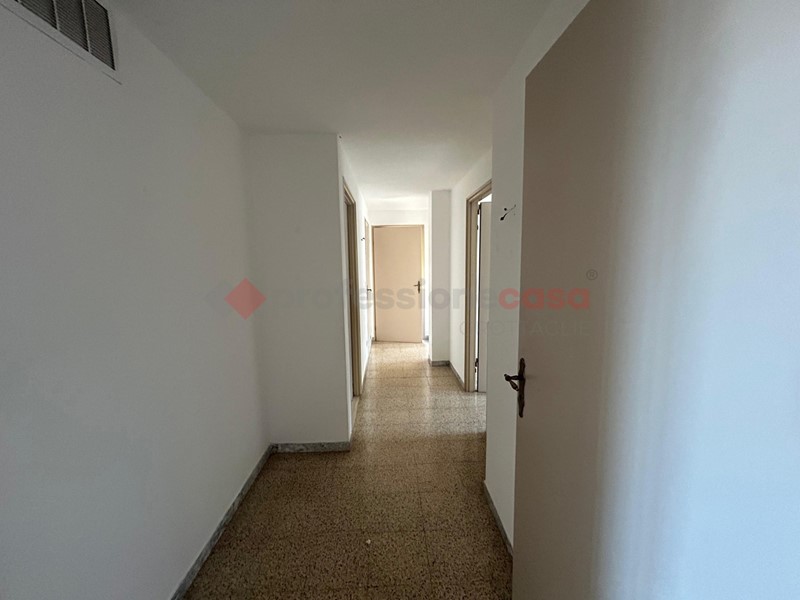 L'unità immobiliare si compone di ingresso con accesso, sulla sinistra, alla cucina abitabile dotata di bagno di servizio e affaccio su una veranda con vista sulle aiuole condominiali. Sulla destra è presente la zona living, anch'essa con veranda e affaccio sulla via principale. La zona notte, raggiungibile attraverso un corridoio, comprende il bagno principale, la camera matrimoniale, due camerette e un ripostiglio.