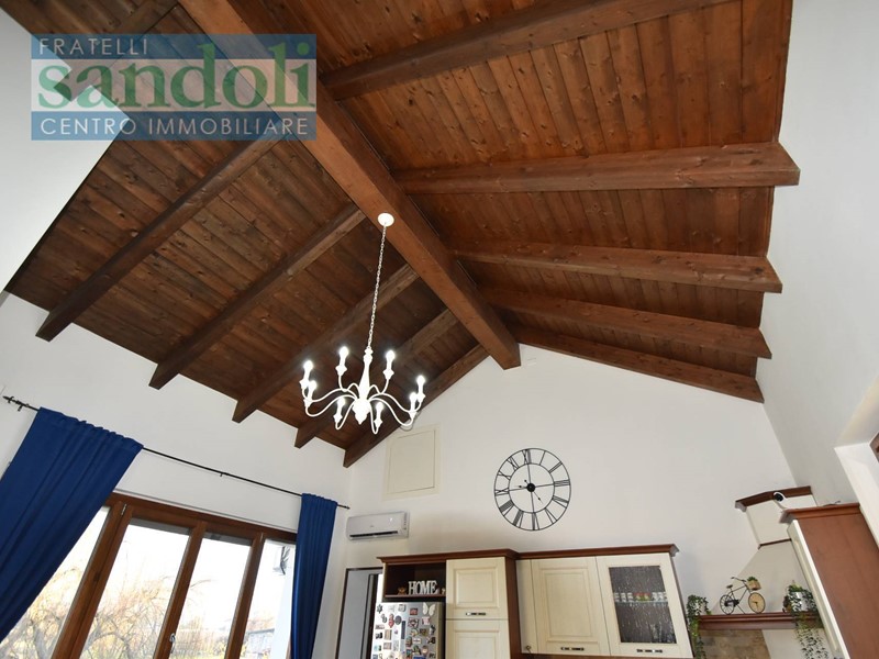 Salendo poi dalla scala in muratura arriviamo al primo piano dove si sviluppa l'appartamento principale composto da una fantastica zona giorno, molto ampia e luminosa composta da un soggiorno con cucina a vista, zona tv e bagno con spazio lavanderia il tutto con splendide travi a vista in legno scuro.