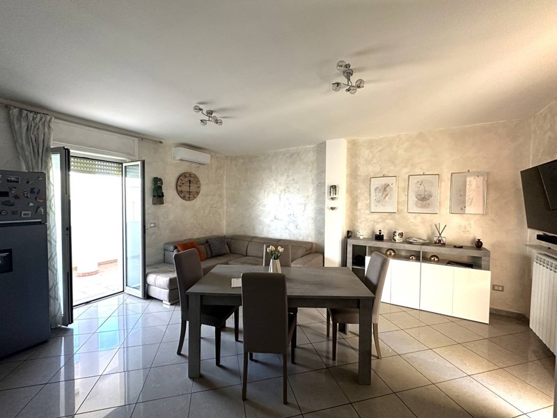 L'abitazione, in condizioni interne eccellenti, si dispone su una metratura commerciale di circa 100 mq ed è composta da ampia zona living con angolo cottura comodo e accesso diretto al terrazzo a livello, ampio ben 55 mq; disimpegno, due camere da letto ampie, spazioso bagno con doccia e secondo balcone.