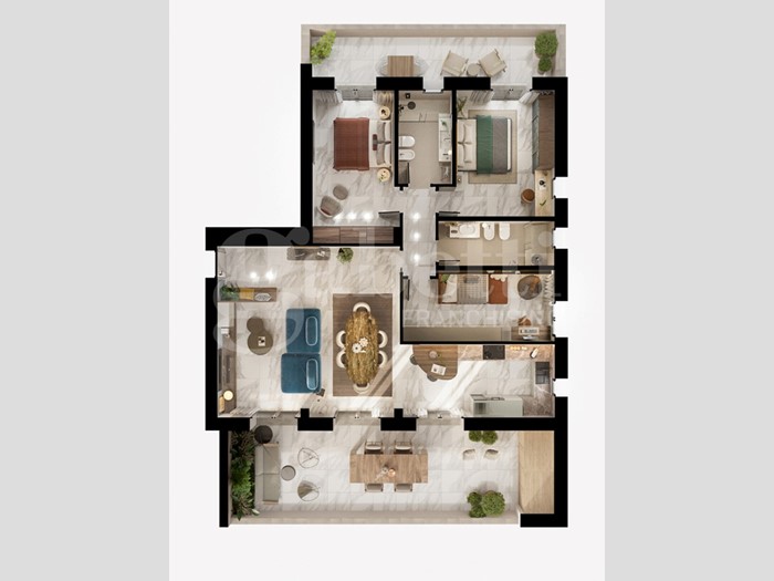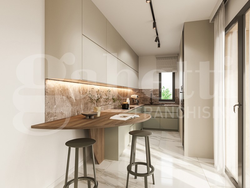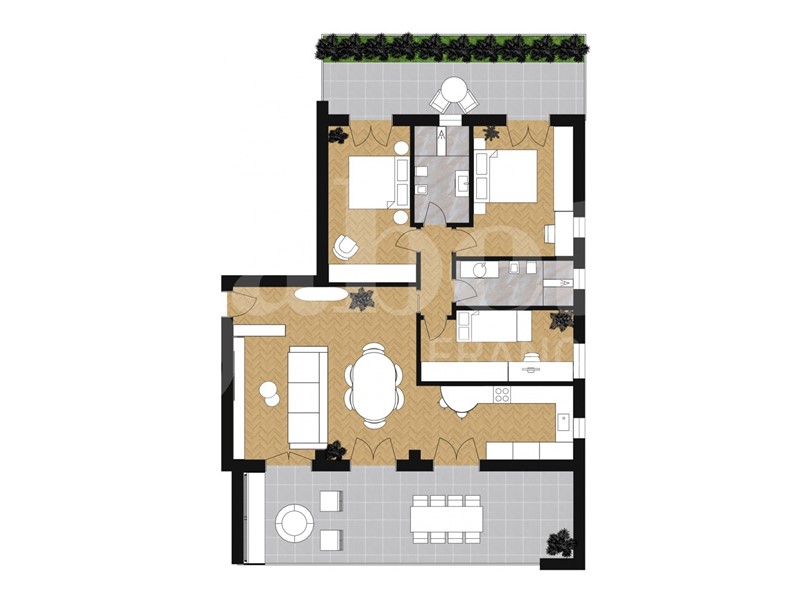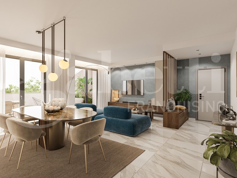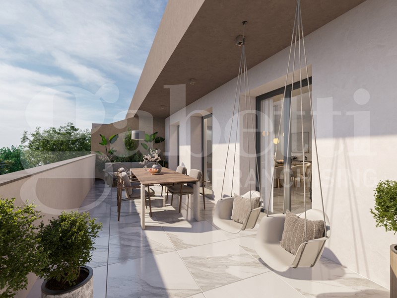 Il più grande appartamento nella palazzina. Questo attico offre la possibilità di vivere in ampi spazi. Quasi 50 mq è l'ambiente soggiorno-cucina, con accesso diretto al grande terrazzo. 2 camere matrimoniali, entrambe con accesso al secondo terrazzo, camera singola e 2 bagni compongono la zona notte.