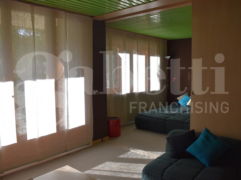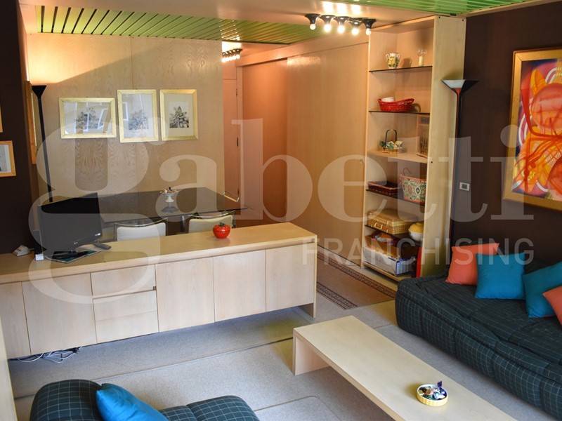 L'ingresso si apre su un comodo disimpegno che conduce a un ampio e luminoso soggiorno, con accesso diretto al giardino di uso esclusivo. L'angolo cottura è a scomparsa, funzionale e ben integrato nell'ambiente.