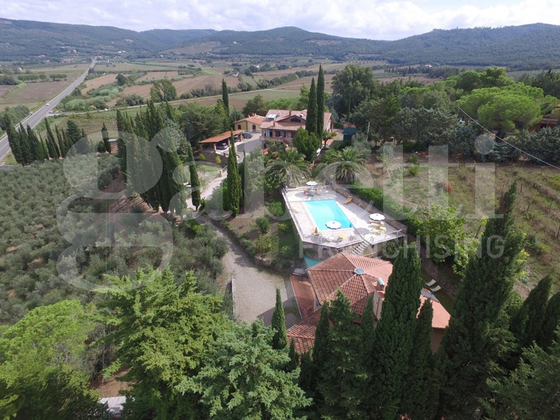 La proprietà include la grande villa padronale, disposta su tre livelli con accesso dall'ampio porticato, con soggiorno doppio che si apre su un lussuoso loggiato chiuso a vetri, cucina abitabile, due camere con ampia terrazza, bagno