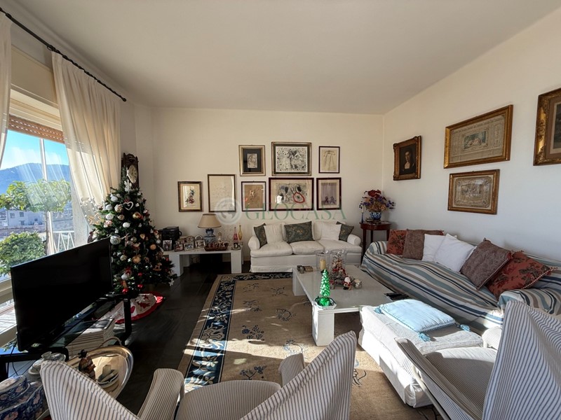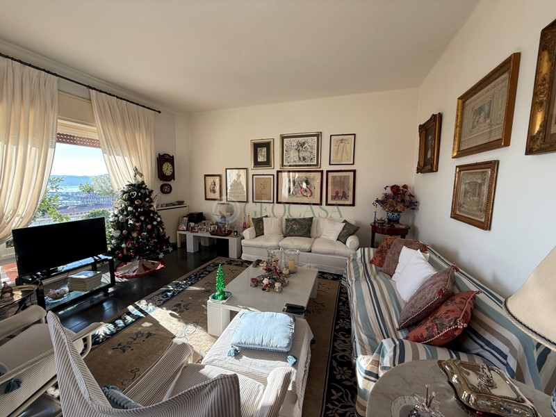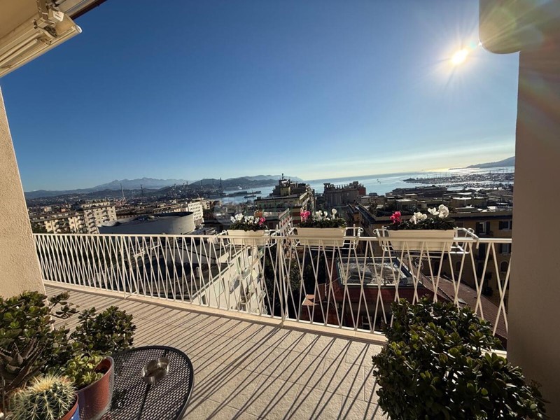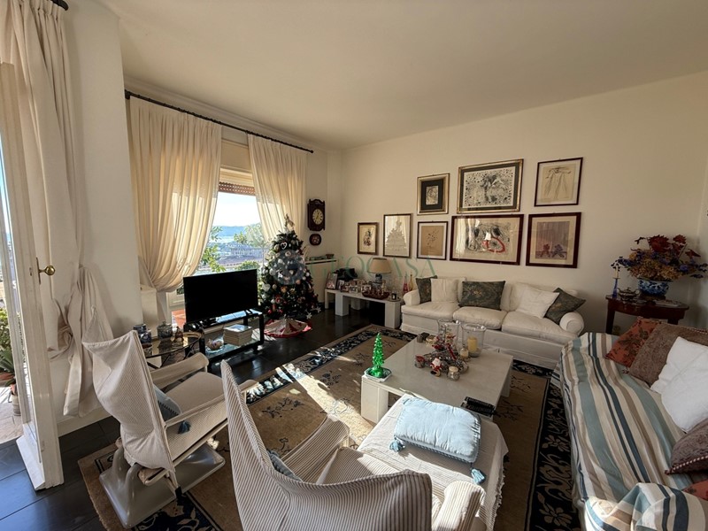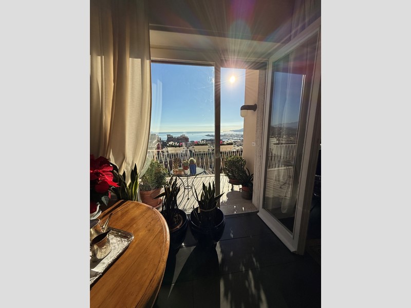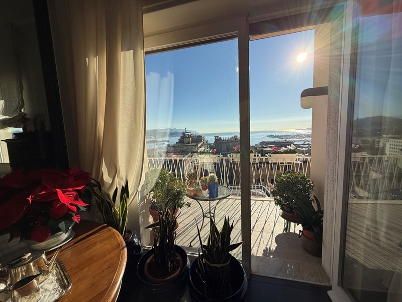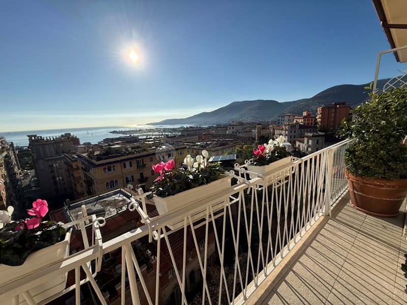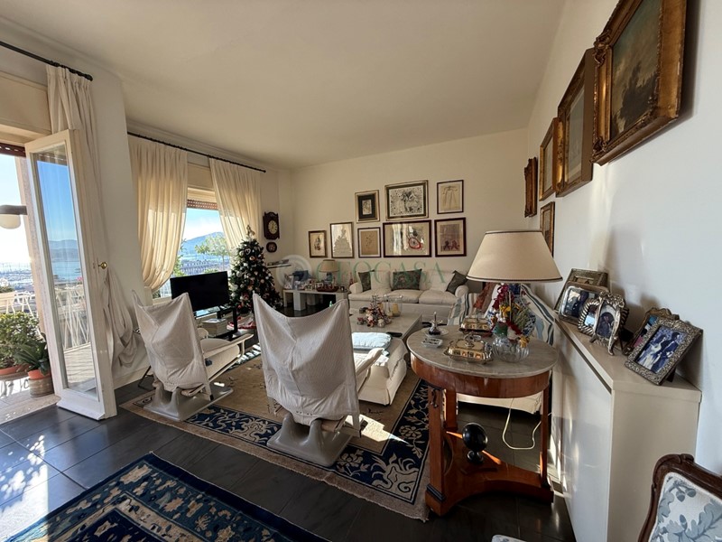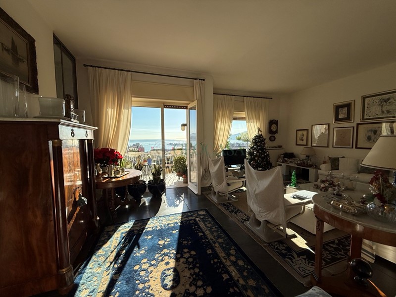 AD.ZE PIAZZA VERDI, in posizione dominante e residenziale proponiamo in vendita nuda proprietà di elegante appartamento di ampia metratura ristrutturato da architetto. L'immobile, luminosissimo, con vista aperta fino al mare ha tripla esposizione e si trova al penultimo piano di signorile stabile anni '70 con ascensore senza barriere architettoniche a cui si accede anche comodamente in auto tramite cancello elettrico. Internamente presenta una moderna suddivisione giorno/notte ed è composto da: ampio ingresso che disimpegna salone doppio con accesso alla terrazza vivibile con vista panoramica mare e monti, cucina abitabile con balcone e zona lavanderia, ripostiglio, servizio finestrato, sala da pranzo collegata alla zona giorno, disimpegno con armadiature, due camere di cui la padronale con sala da bagno con doccia e vasca idromassaggio. Il riscaldamento è autonomo, gli avvolgibili sono elettrici, sono presenti tende da sole Arquati, infissi in legno doppi vetro, boiserie in frassino. Completa la proprietà un'ampia cantina finestrata e due preziosi posti auto di cui uno assegnato. Due sono gli accessi all'immobile di cui uno senza barriere architettoniche in quanto vi si arriva comodamente in auto con entrata da cancello elettrico. Rara reperibilità.