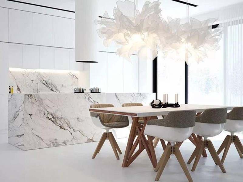 L'ingresso principale si apre su un ampio open space formato da luminoso salone con pavimento in marmo e cucina , anch'essa molto spaziosa e completamente arredata, è perfetta per chi ama cucinare e ricevere ospiti. La villa si sviluppa su tre piani, per un totale di 500 metri quadrati.