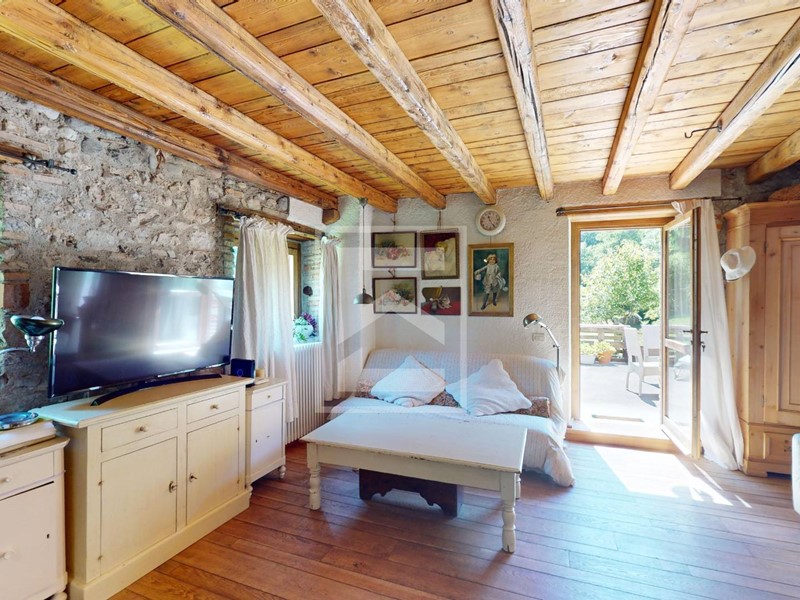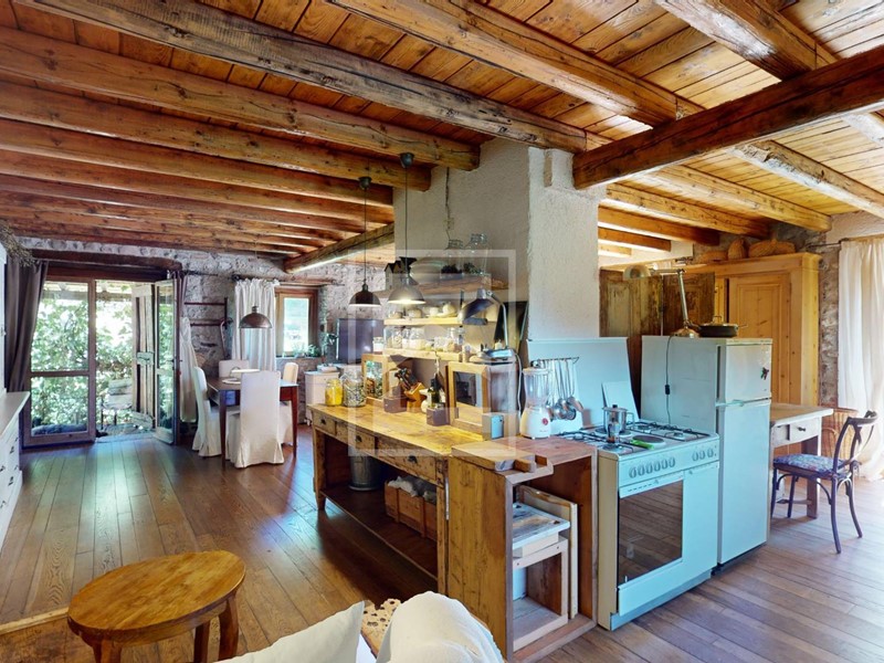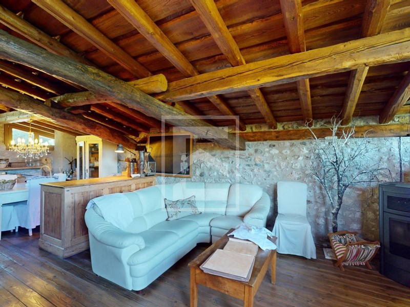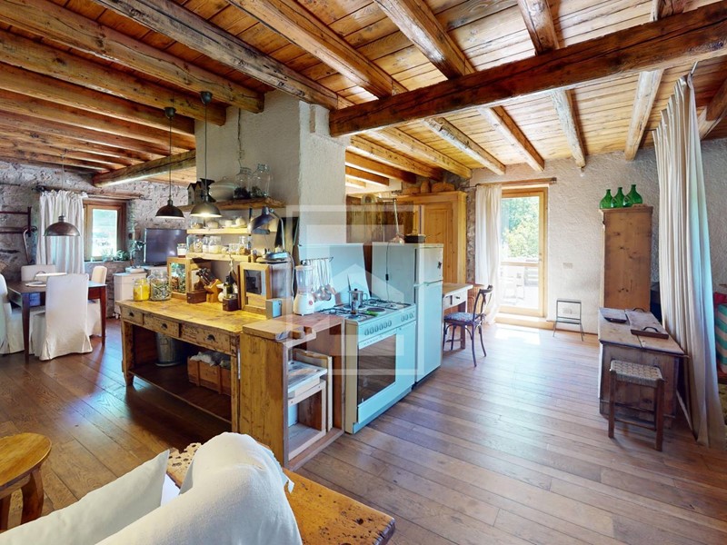 Dal porticato si accede alla zona soggiorno e cucina dove subito si viene accolti dall'atmosfera calda e conviviale che solo questi immobili sanno trasmettere.