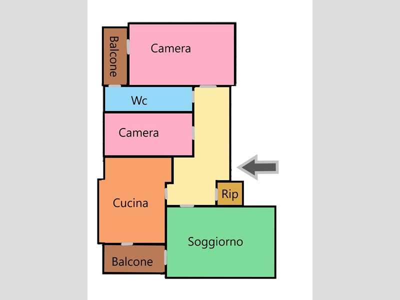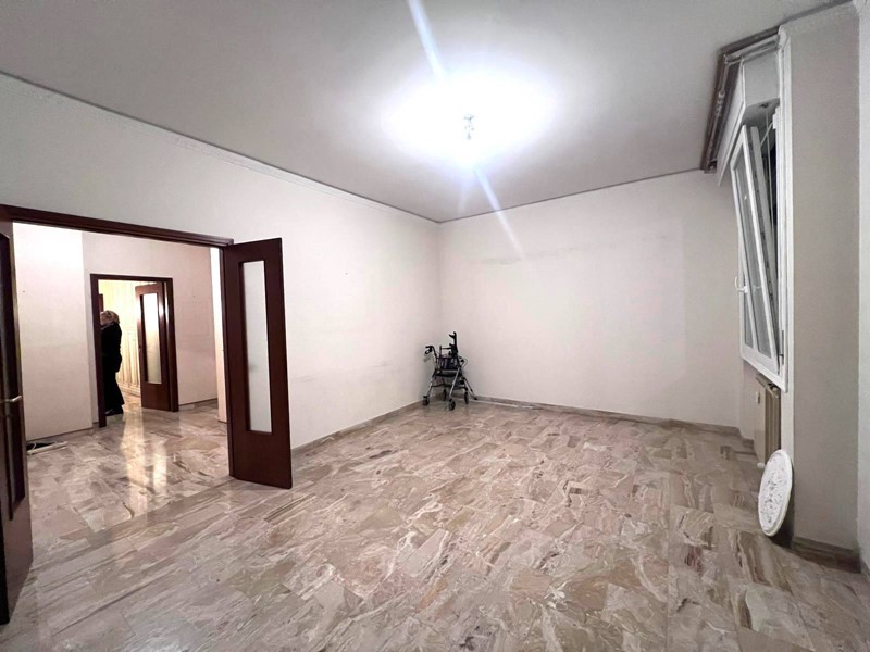 Ingresso ampio, cucina abitabile suddivisa in zona cottura con finestra e zona pranzo dalla quale si accede al balcone, grande sala con possibilità di creare open space, disimpegno notte dal quale si accede a una camera da letto matrimoniale, una camera doppia, servizio con accesso al secondo balcone.