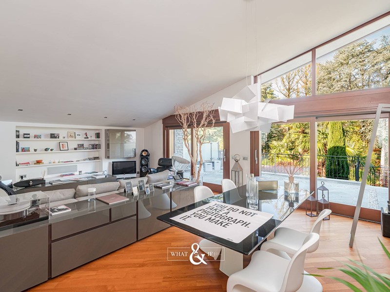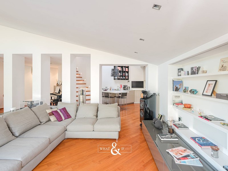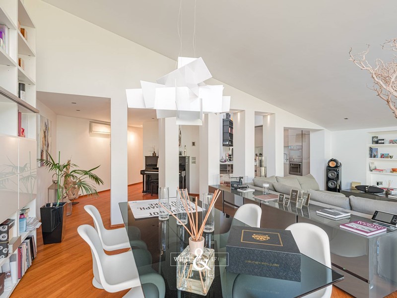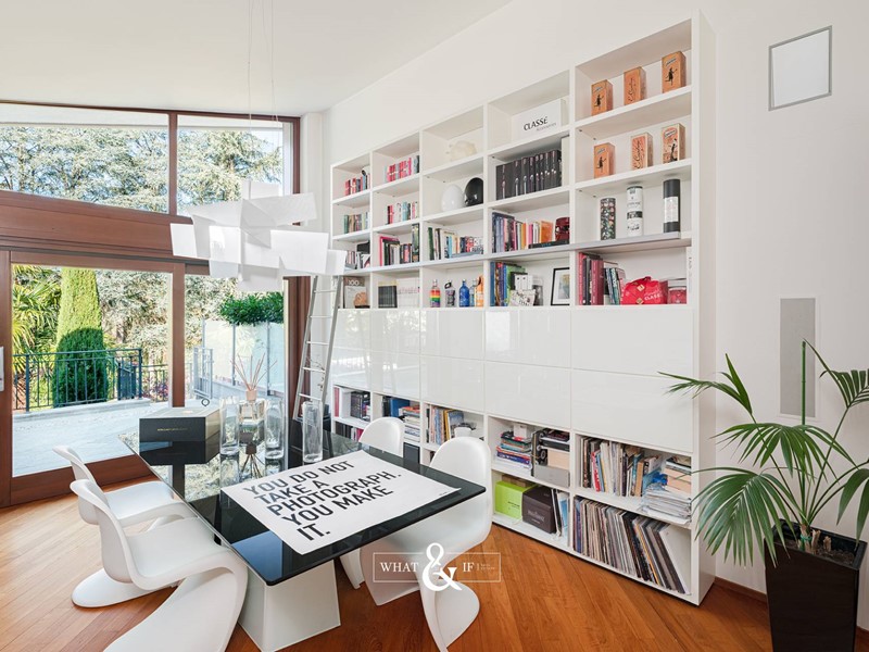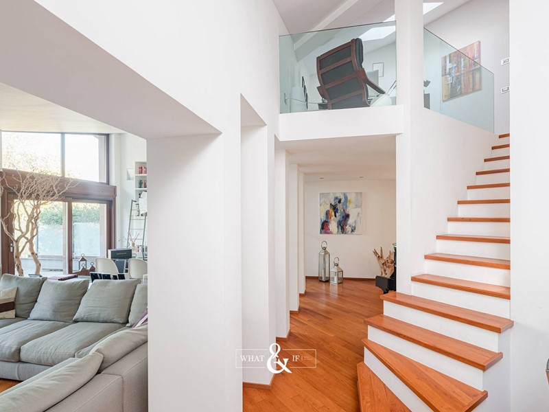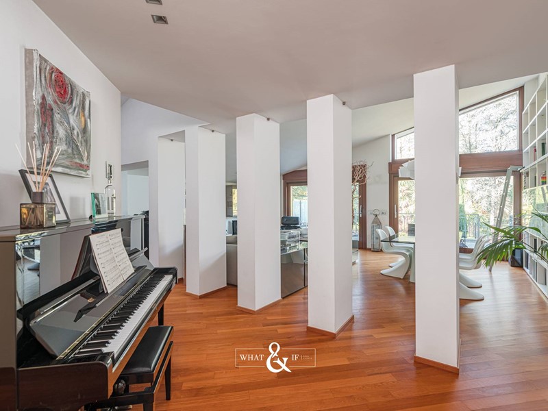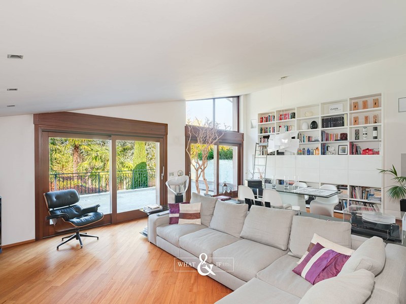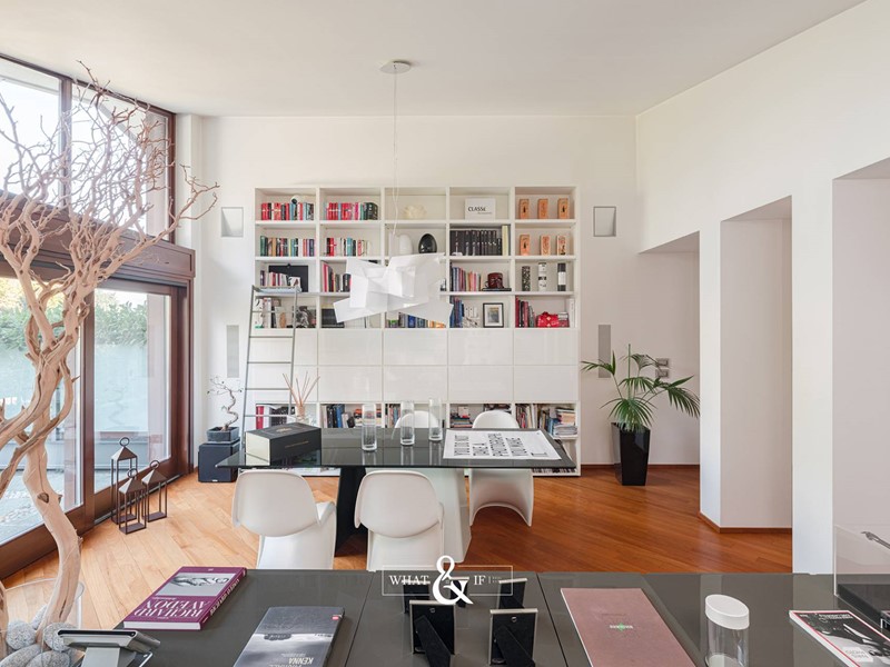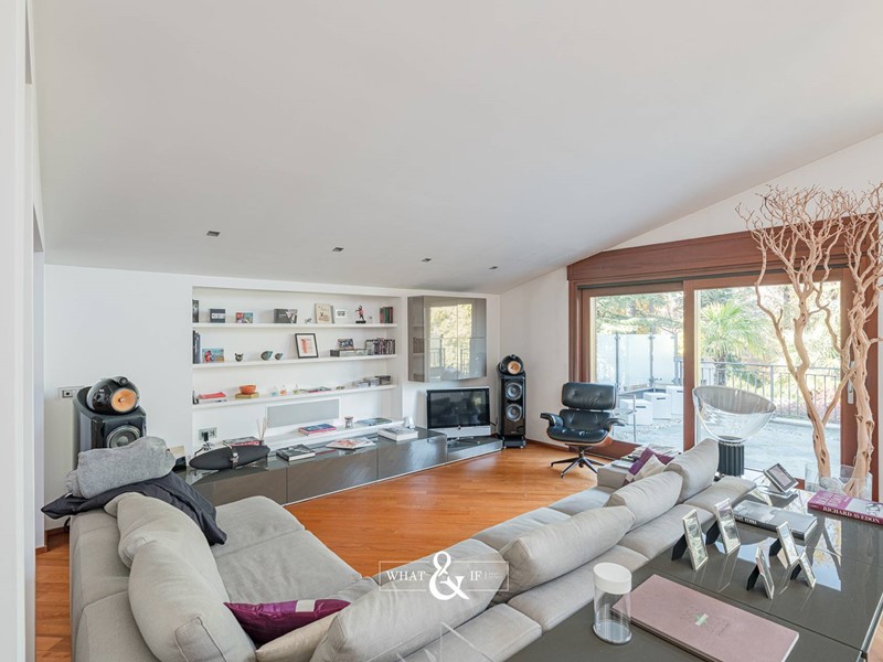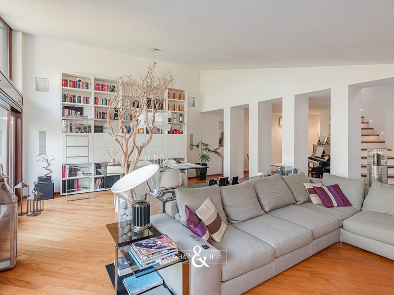 In una bellissima villa degli anni 80, suddivisa in 7 unità immobiliari, proponiamo appartamento di design con ampio terrazzo affacciato sul parco della residenza. Il complesso immobiliare dispone di un parco condominiale di circa 18.000 mq con abeti, area verde, piscina scoperta e un piazzale ad uso parcheggio riservato ai proprietari ed ai loro ospiti. La villa è stata oggetto di ristrutturazione nel 2010. Il piano interrato della residenza ospita un locale fitness, un locale sauna con bagno e doccia, una zona relax con due lettini in legno e con cromoterapia. L'appartamento è composto da un ampio ingresso con una libreria che delimita una zona ospiti completa di divano-letto, bagno con doccia e angolo lavanderia, alto e spazioso soggiorno con meraviglioso affaccio su parte del parco condominiale attraverso le grandi vetrate che permettono alla luce naturale di creare una atmosfera veramente accogliente, angolo cottura a vista, terrazzo e ripostiglio, al piano superiore collegato da scala centrale rivestita in legno troviamo la camera matrimoniale con armadio e cabina armadio su misura (spazio armadi davvero importante), bagno con doccia e doppio lavabo e una zona studio, aperta sulla scala (con possibilità di creare una cameretta chiusa e dotata di velux). Il terrazzo privato è collegato direttamente al giardino condominiale tramite una comoda scala in pietra, rendendo immediato l'accesso alla piscina e all'area verde condominiale. La proprietà dispone di un box doppio in larghezza, un box doppio in lunghezza e due boxes singoli (pertinenziali) per un totale di 6 posti macchina coperti (prezzo a parte per un totale di 60.000). L'appartamento può essere acquistato compreso di arredamento (prezzo a parte).