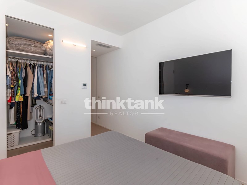 Allingresso troviamo un elegante salotto con parete attrezzata su misura, che funge da elemento di collegamento tra la zona giorno e la zona notte.