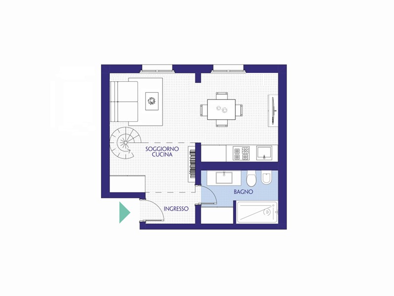 ingresso, monolocale con angolo cottura leggermente separato, soppalco per zona notte, bagno.