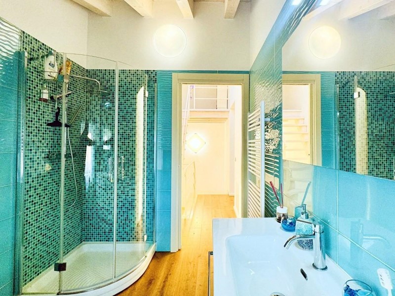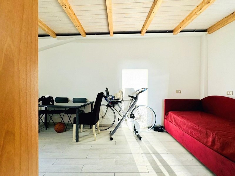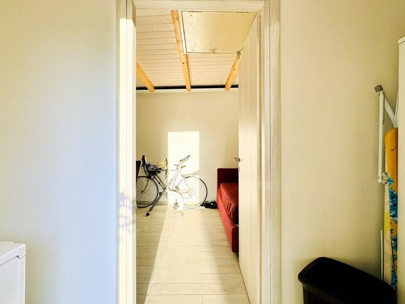L'ingresso avviene al piano terra, rialzato, direttamente nell'ampia e luminosa zona giorno servita da un bagno con box doccia.