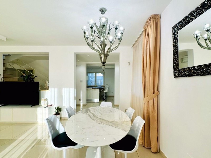 Attraverso il soggiorno con sala da pranzo si accede al porticato esterno, perfetto per il convivio nelle giornate più miti dell'anno.