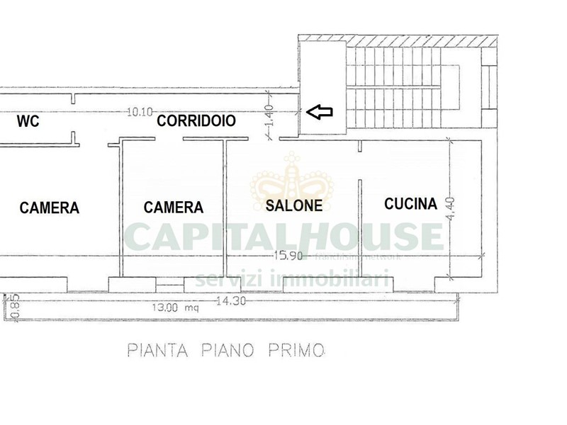 -piano primo: (85MQ INTERNI CALPESTABILI) salone, cucina, 2 camere, bagno e balcone di 13mq;
