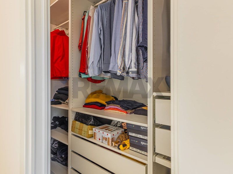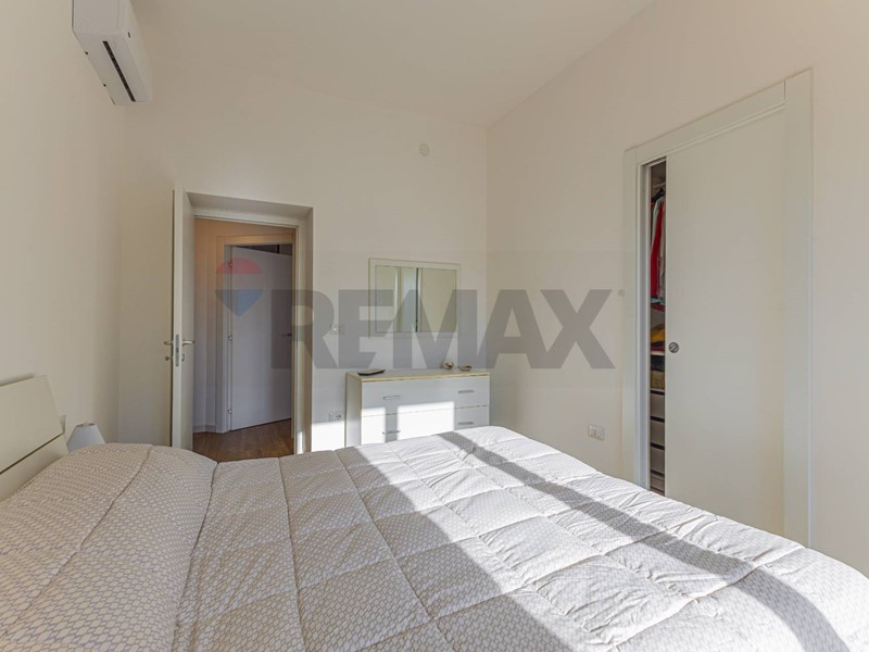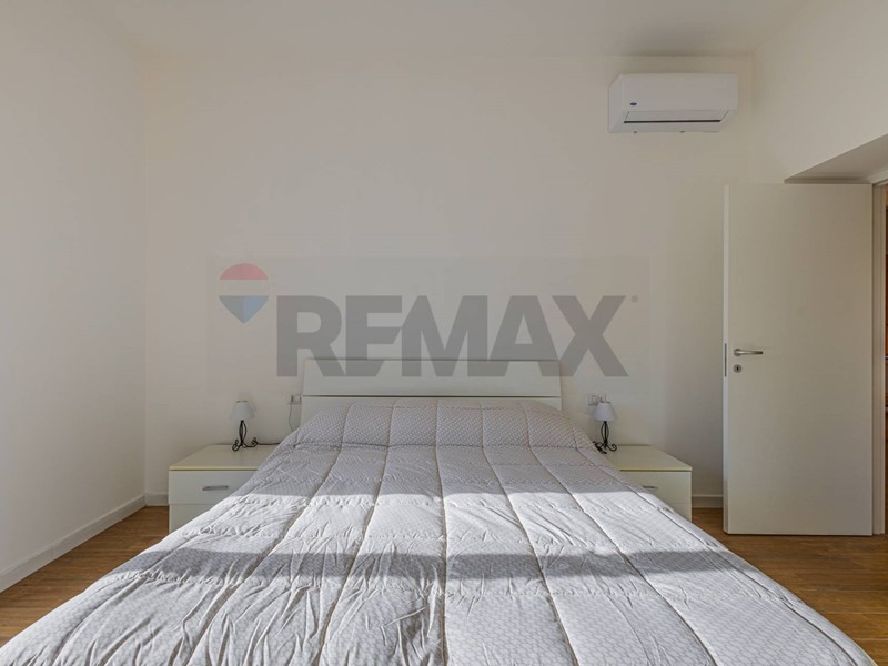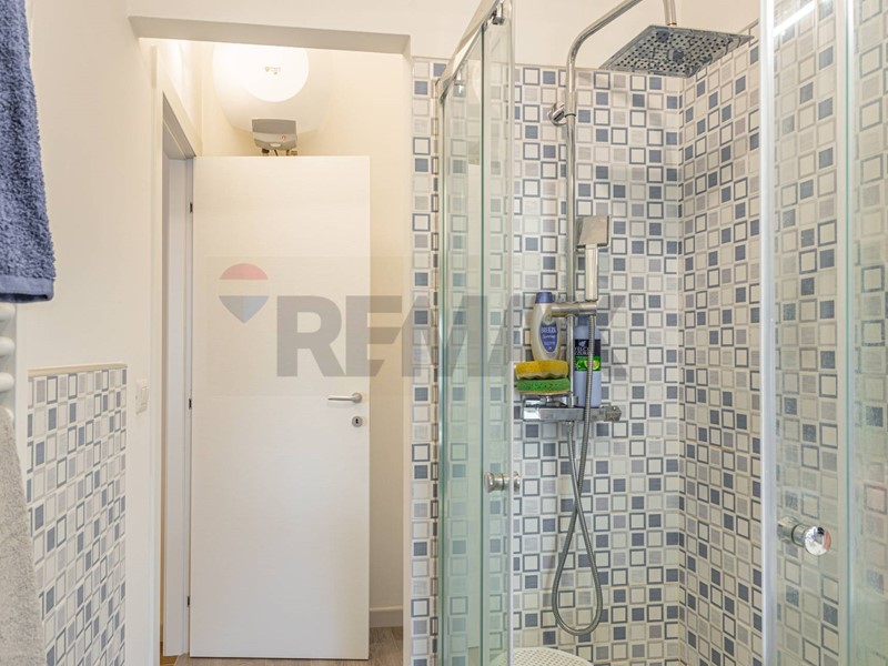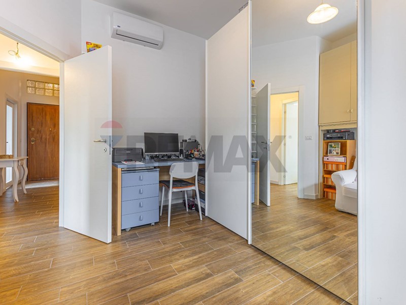 La zona notte comprende due camere da letto: una matrimoniale con cabina armadio e balcone, e una singola con affaccio interno. Completa la proprietà una seconda ampia zona giorno con cucina a vista, uno studio utilizzabile come terza camera, bagno padronale con doccia e secondo bagno con lavanderia.