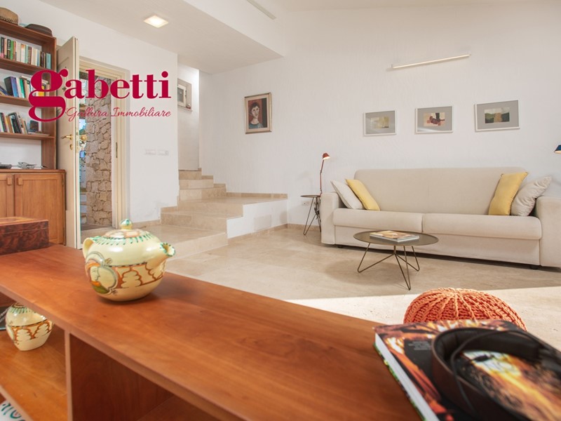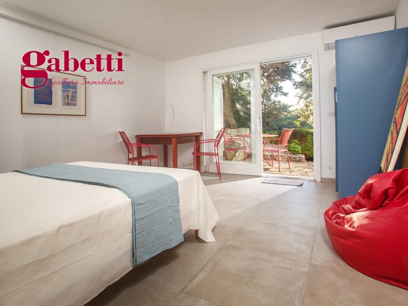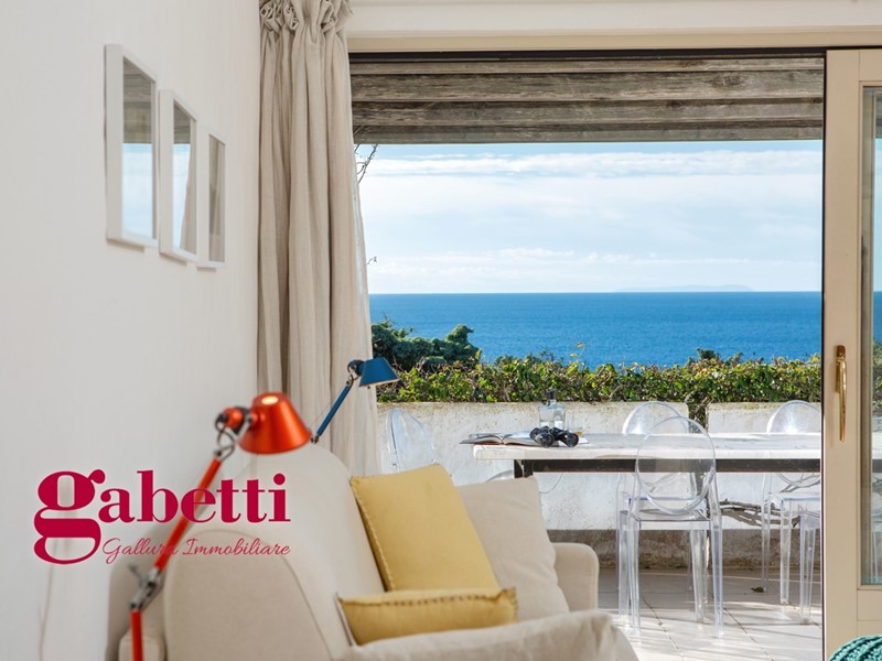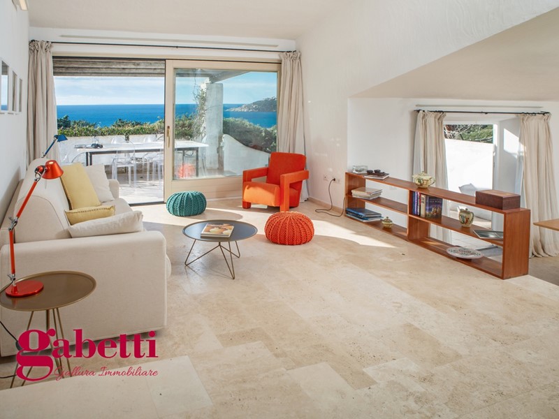 La proprietà è stata progettata per offrire massimo comfort e vivibilità, grazie ad ampie vetrate che creano una naturale continuità tra gli interni, il rigoglioso giardino di macchia mediterranea e l'infinito azzurro del mare. L'ingresso introduce a una zona giorno di grande respiro, sviluppata su piani sfalsati che conferiscono movimento e raffinatezza agli spazi. L'elegante area living dialoga armoniosamente con la cucina di design, realizzata su misura e perfettamente integrata nel contesto.