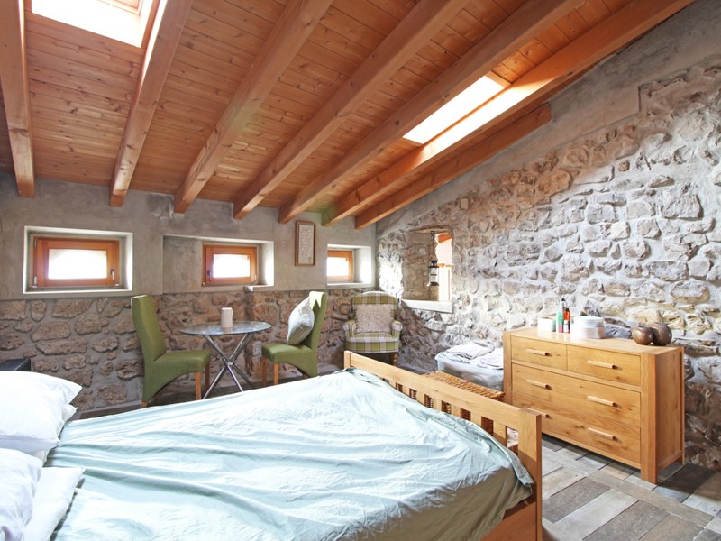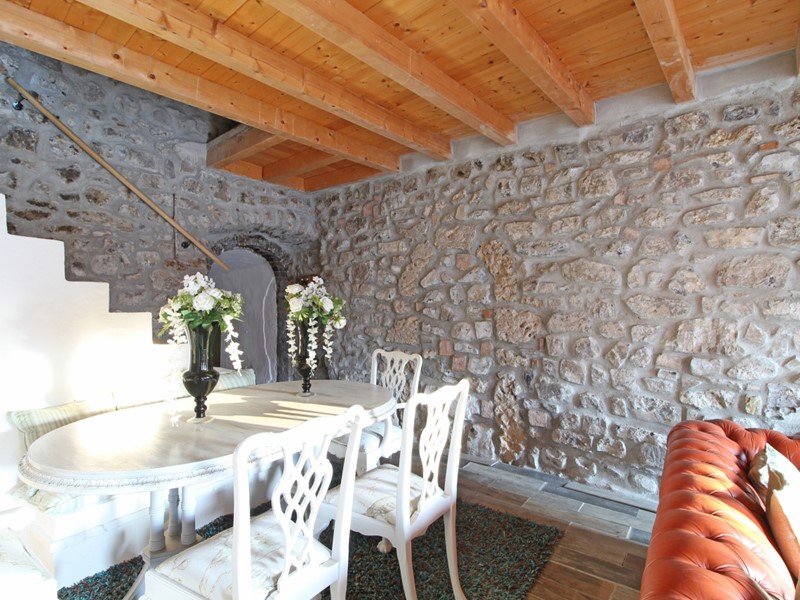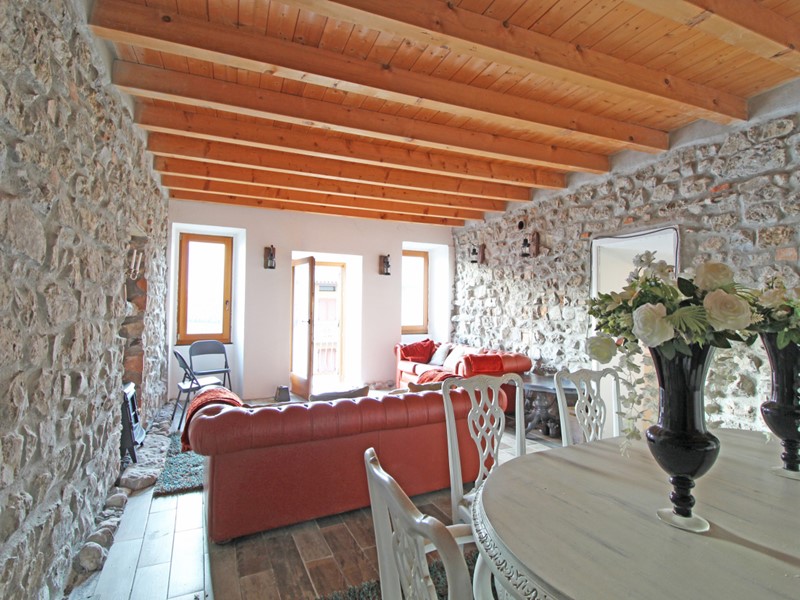 L'edificio si sviluppa su tre livelli: al piano principale è presente la zona giorno con cucina abitabile, due stanze di servizio e il salotto principale con balcone affacciato sul lago; al primo piano, tutto con travi a vista, troviamo una prima stanza con angolo camino, un ampio bagno di due ambienti e una grande camera matrimoniale; al piano seminterrato ci sono inoltre due ambienti adibiti a cantina.